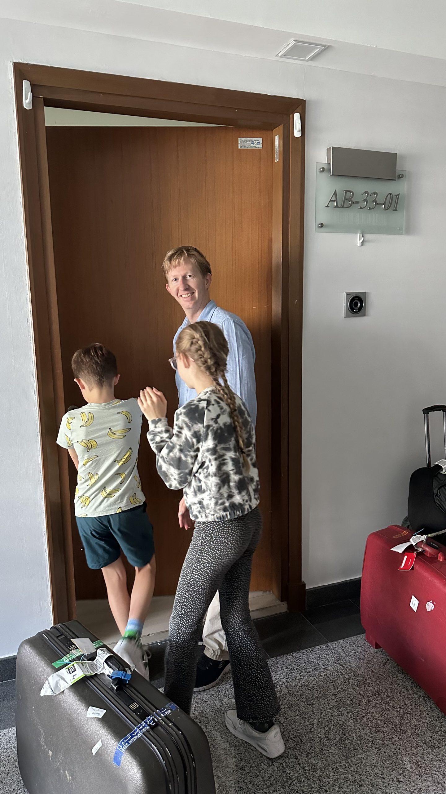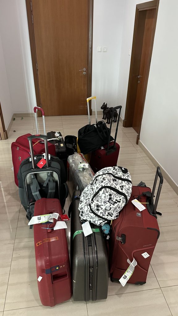 Ondanks de vertraagde vlucht (we vertrokken uiteindelijk ruim een uur na het in eerste instantie geplande vertrek), komen we toch rond de verwachte tijd aan. De vlucht verloopt redelijk soepel. Even was er lichte paniek omdat de schermpjes het in het hele vliegtuig niet bleken te doen, maar na een reset kwam het toch nog goed. We eten lekkere ‘tandoori kip met rijst en boontjes’ (of niet), pakken kadootjes van vriendjes uit, bingen de ene Lego Ninjago na de andere en vallen dan uiteindelijk toch nog in slaap. Aangekomen op KLIA lopen we naar de bus (want de Aerotrain is in onderhoud) en krijgen onderweg een ‘complimentary welcome drink’ (een ijskoude mierzoete lychee ‘juice’). Bij de kofferband worden we door een Nederlandse vrouw met haar twee kinderen herkend als ‘verhuizers’ .. de sh*tload aan baggage gave it away. Ze bied aan om ons evt. op weg te helpen aangezien ze ook in Mont Kiara woont en de kinderen naar dezelfde school gaan. Door de douane heen twijfelen we of we een Taxi zullen nemen omdat we zoveel bagage hebben, maar gaan toch voor de Grab (een soort Uber). Na een paar afwijzingen, gaan we voor de duurste wagen en die komt dan al gauw. Met gemak past alle baggage er in, en worden we prinsheerlijk naar ons nieuwe onderkomen gereden. We laden de bagage uit (ff twee keer heen en weer met de lift) en zetten alles in de hal. We zijn thuis!