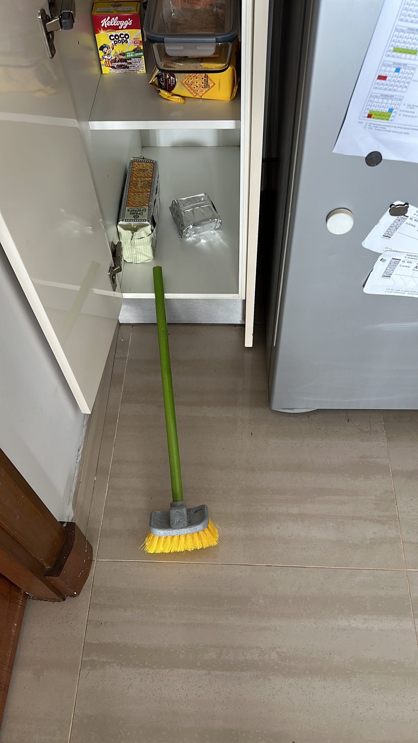 De volgende dag begin ik weer vol goede moed aan de deep clean van de keuken. Het kost even tijd, maar als het zó vies is dan heb je wel lekker eer van je werk (zo kun je het ook bekijken). Ondertussen probeer ik de kinderen ook wat te laten helpen maar daar hebben ze natuurlijk niet al te veel zin in. En als ze dan eenmaal met een doekje in de hand staan, dan is het een kwestie van wachten op een “AU! “ of “Hou op!” omdat ze dan net ff te dicht in de buurt van de ander komen wat ze dan ineens niet meer zo goed kunnen verdragen. Door steeds als een scheidsrechter te moeten optreden schiet het ook niet echt op met poetsen dus uiteindelijk sta ik dan toch weer alleen te poetsen en trek ik gewoon de deur dicht om hun gekibbel niet te horen. Uiteindelijk is het zó gezellig dat de dweilstok die nog geen 24 uur oud was er aan moet geloven. Gelukkig kostte die maar 35 cent (omgerekend vanuit MYR): kortom, het kon erger :-).