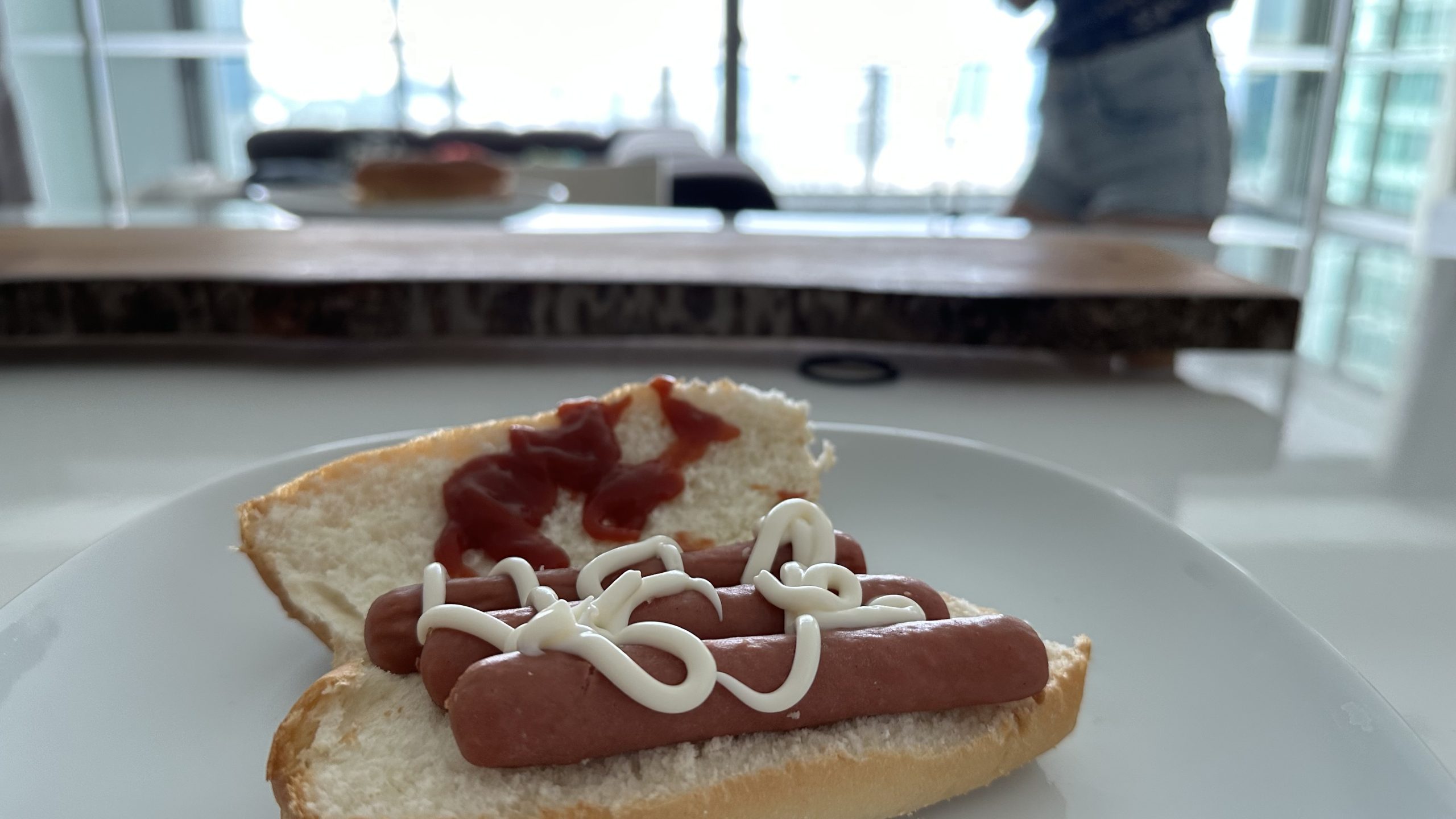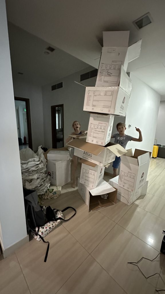 Ondanks al het gedoe lukt het toch om mijn doel te halen: de wet kitchen voor de lunch schoon genoeg krijgen om te kunnen beginnen met uitpakken en kasten vullen. De noodlesoepjes zijn op thuis, dus we gaan lekker op pad om te lunchen.. even onszelf belonen. Helaas gaat het in de lift naar beneden alweer mis, dus in plaats van ff ergens te gaan lunchen besluit ik dat we ‘gewoon iets uit de supermarkt‘ gaan lunchen om toch maar iets van een statement te maken. Tja, je probeert wat. Bij de Village Grocer vinden we een heus volkoren brood(je) met een soort van korstje dat ook nog best betaalbaar is (2 euro). Ook hebben ze hotdog-puntjes dus besluiten we dat dat de lunch wordt. We kopen wat ketchup ‘sos’ (saus), mayo en mosterd en zoeken naar iets van knakworstjes in blik. We vinden ze uiteindelijk, en er is maar 1 merk: Unox! De ‘runderknaks’ die we thuis ook gewoon hebben. Kost hier wel ruim 5 euro, maar ach, daar hebben we onze ‘COLA’ (Cost of Living Allowance) voor. Ook kopen we nog wat volkoren Libanees brood (zo’n grote pannenkoekachtig brood). Thuis laten we het ons goed smaken. Het Libanese brood met een flinke lik ‘JIF’ pindakaas doet met denken aan Oman (of was het daar Peter Pan?) en de kinderen vinden het gelukkig ook lekker. Een prima optie voor de schoollunch.