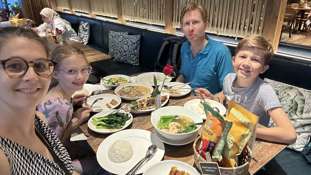 Dan is het tijd om te eten. Vanavond wordt het Madam Kwan, al sinds 1977 een begrip. Goed jaar is dat toch. We bestellen rojak (ik vind het heerlijk, maar het valt bij de rest niet zo in de smaak), dumpling soup, char kway teow, nog een stir fry met ‘lily bulbs’ en, altijd lekker: kailan met garlic. De porties (vooral van de appetizers) zijn riant. We moeten eraan gaan wennen dat 4 hoofdgerechten eigenlijk niet nodig is. Na de overdadige maaltijd gaan we weer langs onze grote vriend Mr DIY voor een nieuwe stok (en stiekem altijd weer meer dan we eigenlijk voor kwamen, zo gaat dat ook altijd met de Action tenslotte). Ook deze dag zit er weer op!