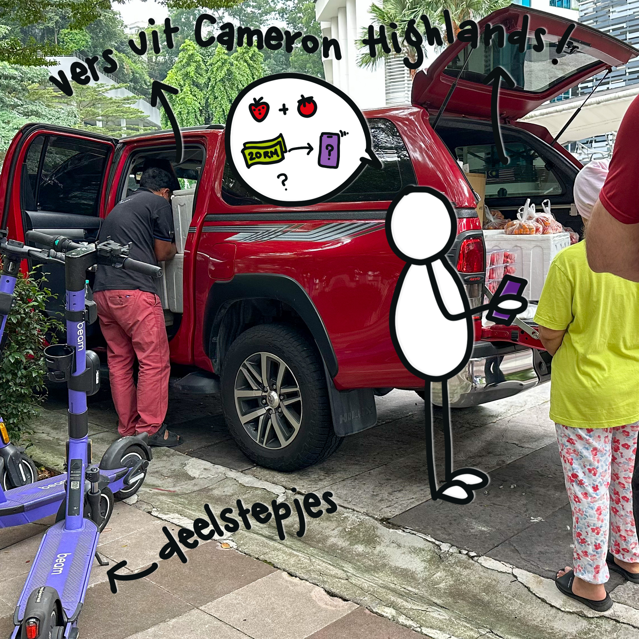 Het werd wel weer eens tijd om wat te delen. Hier een eerste afbeelding van wat er In Maleisië anders gaat dan ik in NL gewend was: aardbeien (en tomaten) kopen! Die heb ik eerder deze week besteld in een whatsapp-groep van het appartement. Ze zijn vanochtend komen rijden uit de Cameron Highlands en als ze er zijn sturen ze een appje: we zijn er, kom maar halen! Was nog ff uitzoeken waar ‘er’ was: buiten op straat uit de achterbak van de auto tussen de gedumpte deelstepjes. Dan moet er nog even betaald worden met de obscure bank-app en het bewijs getoond en je krijgt je fruit mee. En zoals bij elke aankoop hier zeg ik dan: no bag please (want de plastic zakjes vliegen je om de oren).