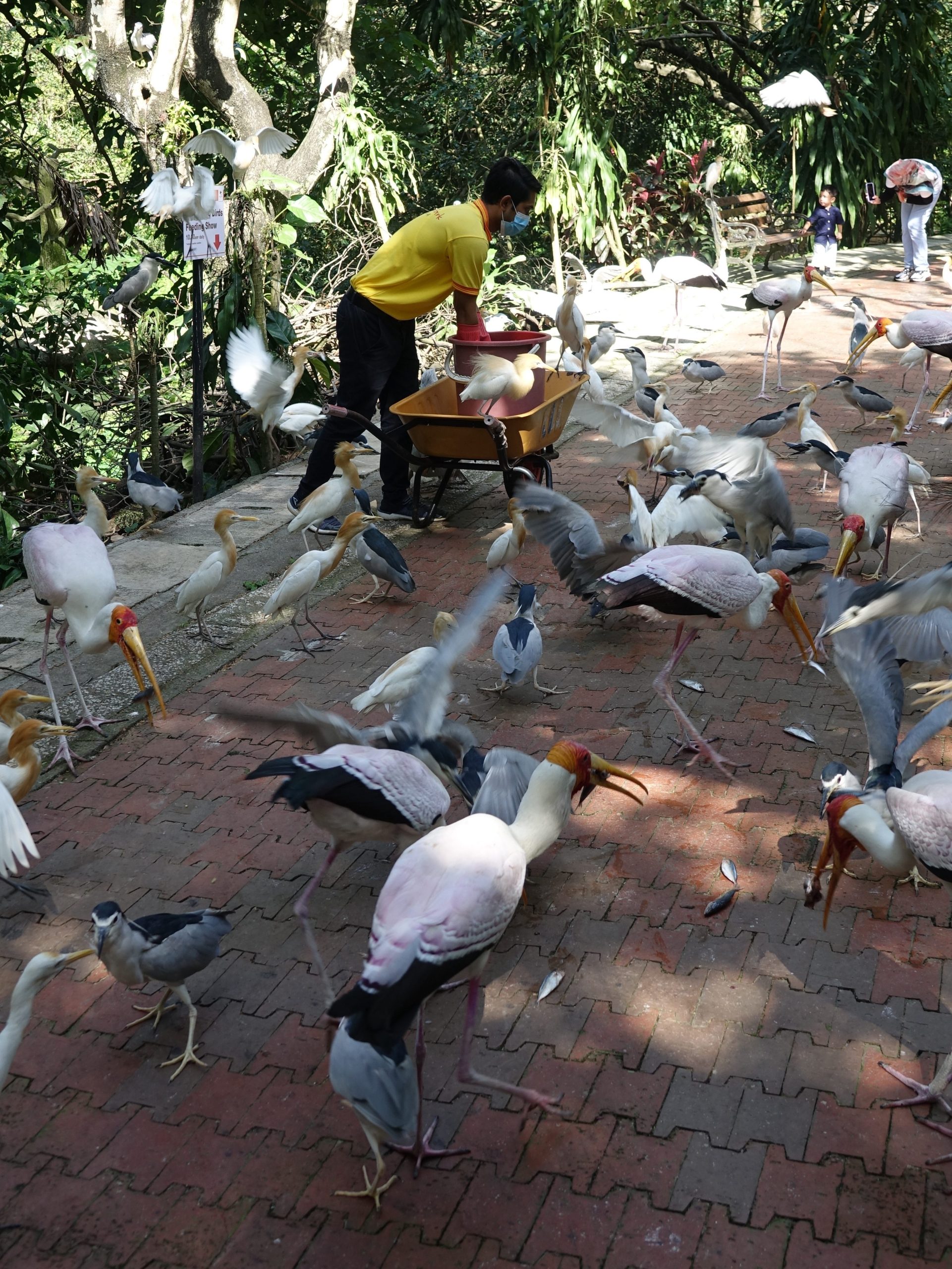 Rond half elf komt er een mannetje met emmer en fluit voorbij, en is het blijkbaar voedertijd voor de rondvliegende vogels. Ze komen overal vandaan als het mannetje de vissen door de lucht gooit. We schieten wat plaatjes en vervolgen onze weg door het park. Veel vogels, maar ook apen en een enkele “monitor lizard” worden gespot.