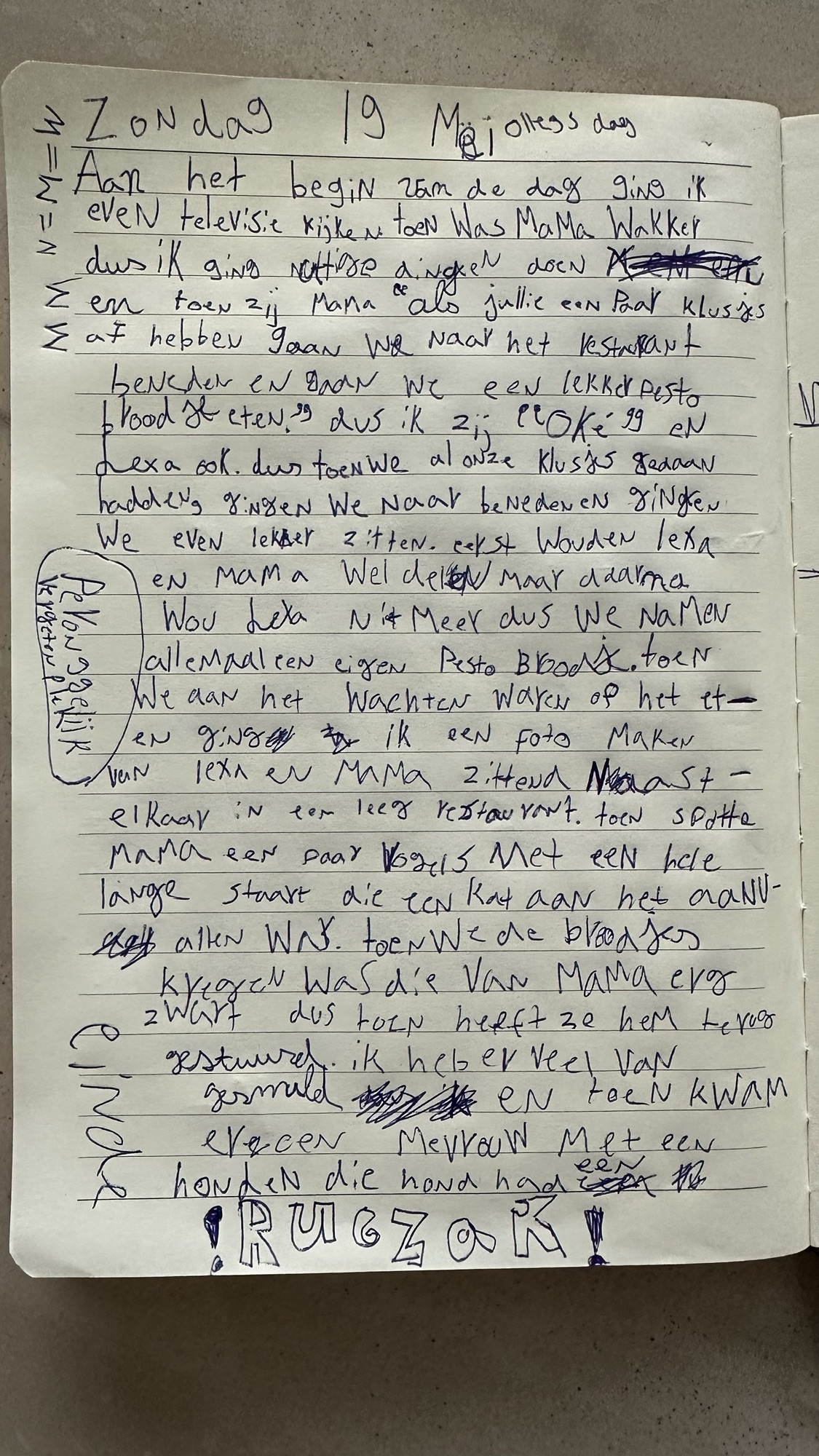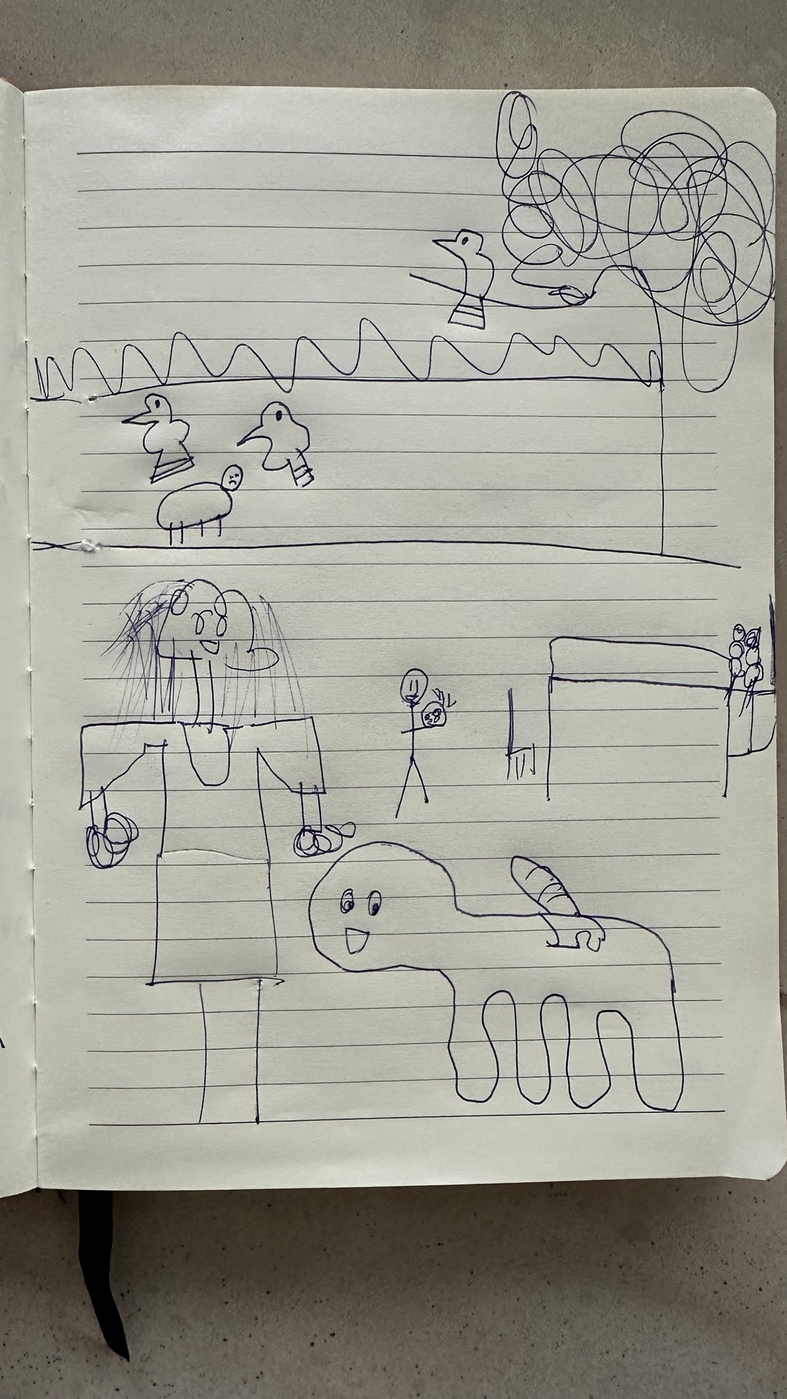 Op de tekening zie je de vogels (met flinke waaierstaartjes) die de kat aanvielen, daaronder zie je Olle die een foto van Lexa en mij maakt in het verder helemaal lege restaurant. En op de voorgrond de vrouw met de flinke hond met rugzak die het hele restaurant even doortrippelde.