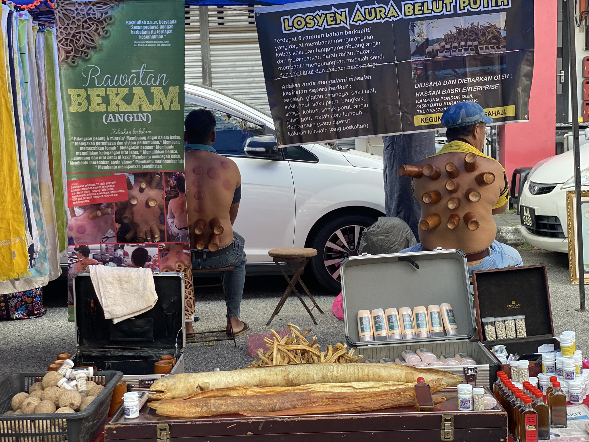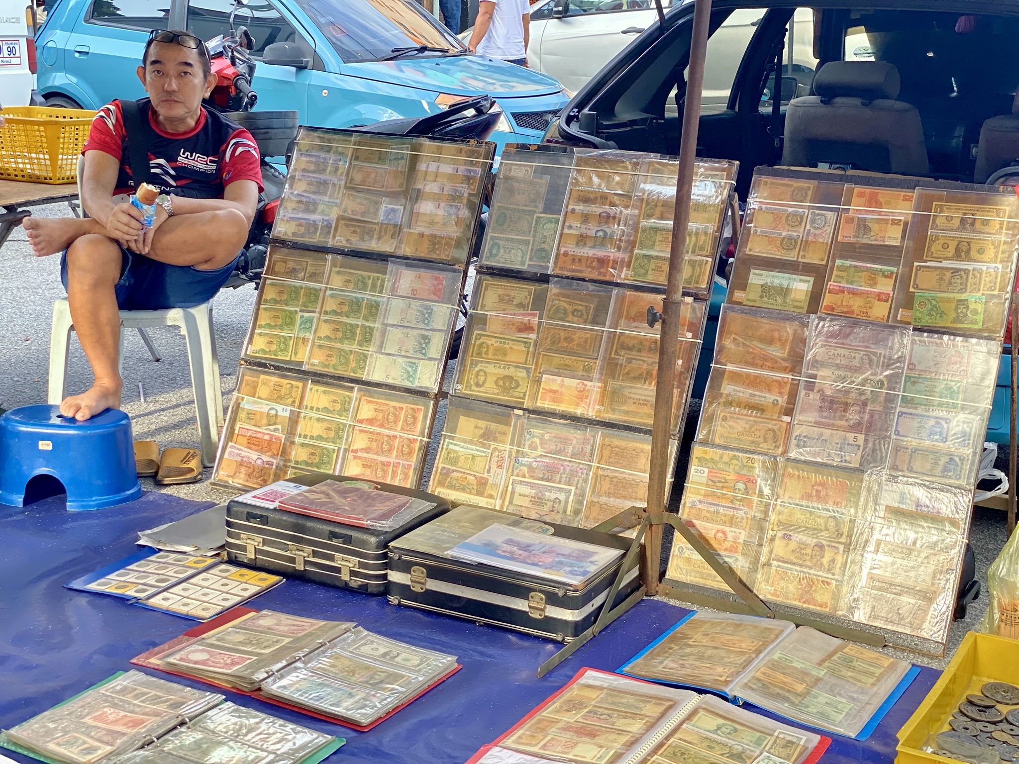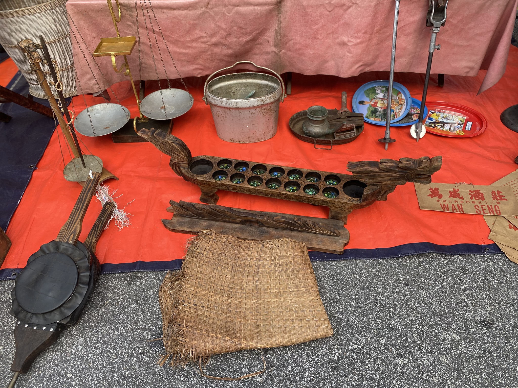 We staan op tijd op om de zondagse flee market te bezoeken in de hoop dat we daar een leuke Congkak vinden (een van de geappte tips). Heel grappig om de Maleise variant van de rommelmarkt te zien en o.a. Olle vindt er veel fotogenieks. We zien ook al gauw een congkak-spel, maar wel een hele (te) fancy versie met drakenkop en deksel die ook nog eens 400 RM kost. Helaas zien we er daarna geen meer, dus Olle bestelt in het Maleis nog wat lekkere vers gebakken Apam Balik met een schepje zoete cream of corn er in (hij vraagt ’empat’ en zegt keurig ‘terima kasih’) om ons karige ontbijtje wat aan te vullen.