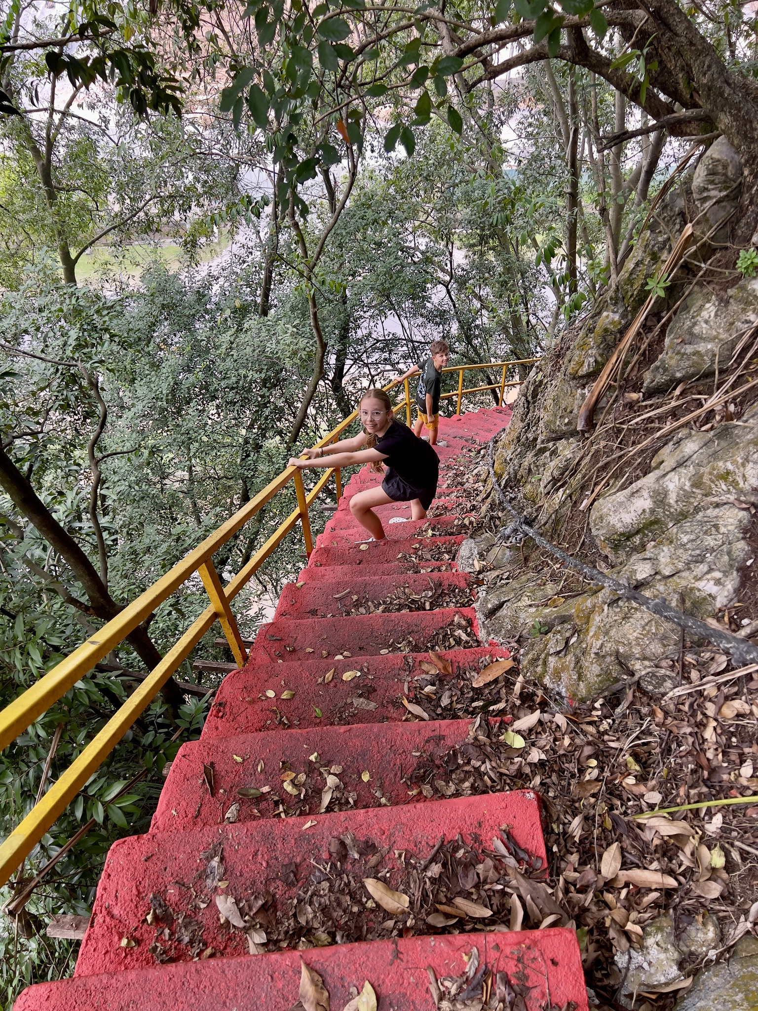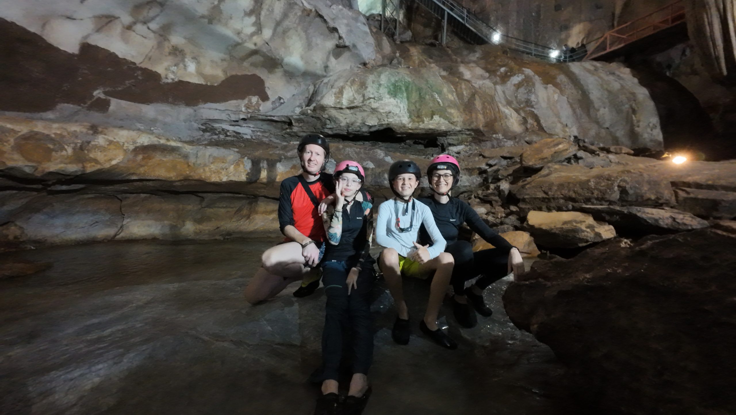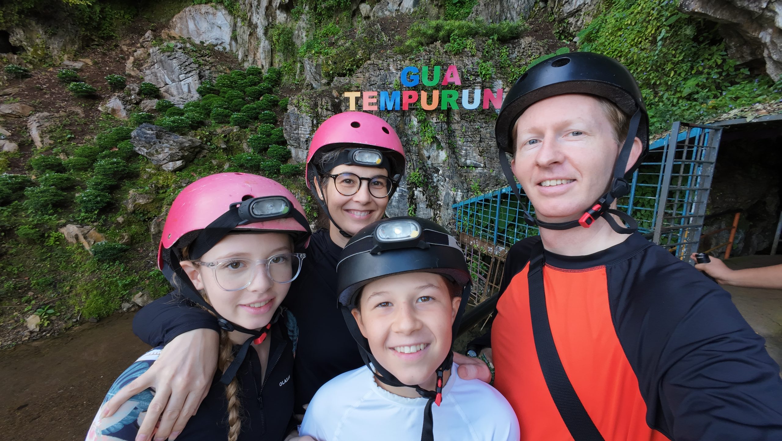 Vandaag staan we vroeg op, en dat levert ons een mooie zonsopgang op vanuit onze AirBnB. We eten wat vruchtenyoghurt met kitkat-cereal (na uitvoerige studie van de kinderen bleek deze de minste suiker en meeste vezels te hebben), laden alles weer in de auto en leveren de sleutel in. Om 9 uur stipt melden we ons bij Gua Tempurung, al helemaal in onze zwemkleren, voor de wet tour, maar het loketje is nog niet eens open. Als het loketje tien minuten later toch nog open gaat kopen we ons kaartje, regelen we onze helmen en hoofdlampjes en wachten dan nog (niet al te geduldig) op de rest van onze groep. Uiteindelijk lopen we om 10 uur dan eindelijk de grot in. Het eerste stuk lopen we over betonnen paden en trappen door een (immense!) grot (dat overlapt met de ‘dry tour’). Dan mogen de hoofdlampjes aan en dalen we behoorlijk af naar beneden om met de wet tour te beginnen. We moeten eerst een voor een van een stuk rots af glijden en laten ons opvangen door onze gids (Lexa keek weer even zoals op de zwarte piste maar kwam toch wel beneden), klauteren dan door wat water, laten ons vervolgens door een gat zakken, tijgeren nog wat door het water in het pikdonker met de lampjes uit en komen uiteindelijk uit waar we begonnen, maar dan in het water in plaats van op het betonnen pad. Een leuk avontuur en voor herhaling vatbaar (ze hebben ook nog een langere wet tour).