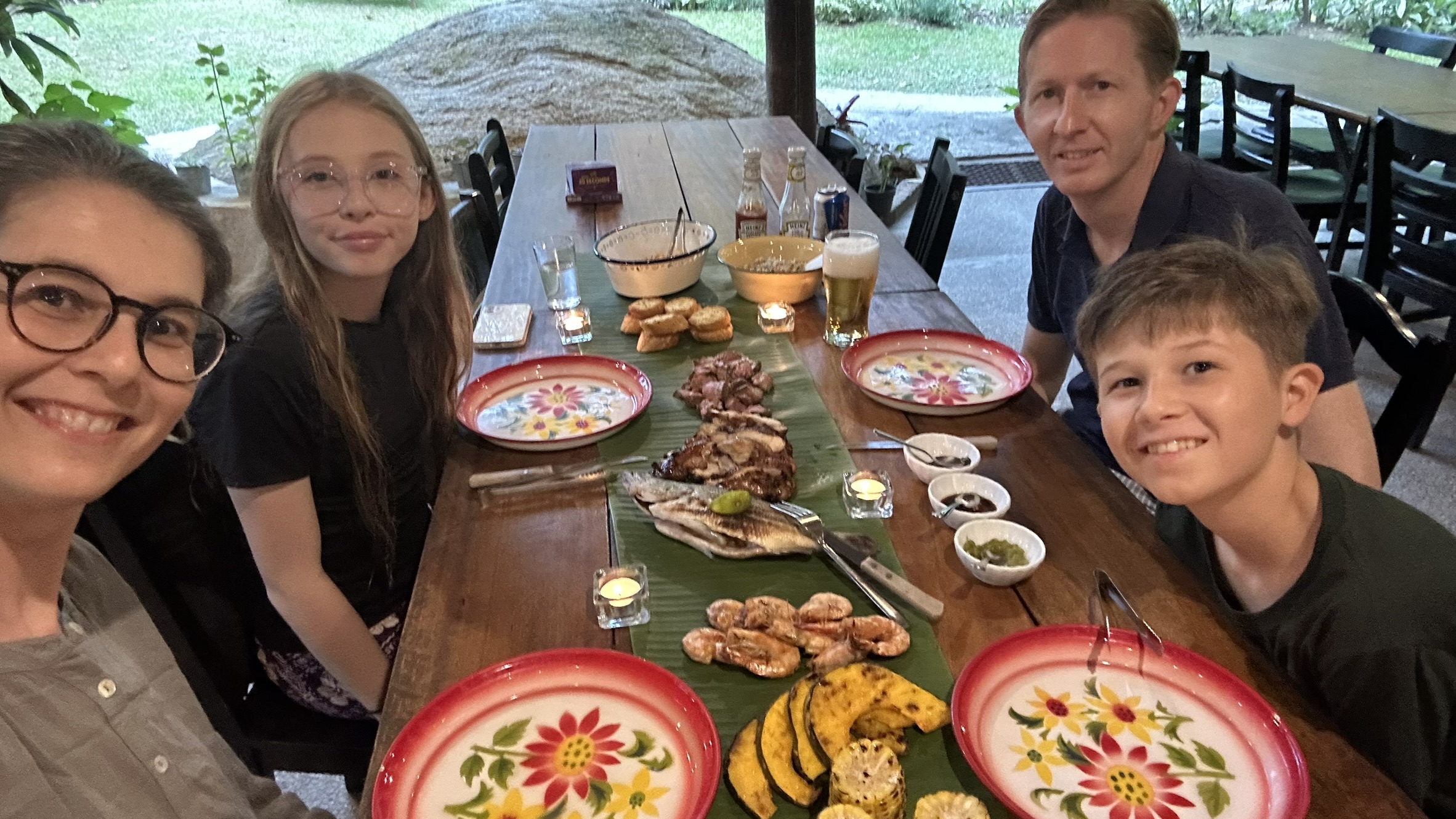 We krijgen op een bananenblad een uitgebreide en goed verzorgde bbq geserveerd en sluiten de avond af met twee marshmallows bij het kampvuurtje en een paar muggenbulten. Dan de bedjes in om te slapen bij het (toch niet zo rustgevende) geruis van de rivier (het klinkt meer alsof je naast een flink ronkende machinekamer ligt). Met de actieve dagen achter ons is het lichaam gelukkig goed vermoeid en lukt het slapen toch prima.