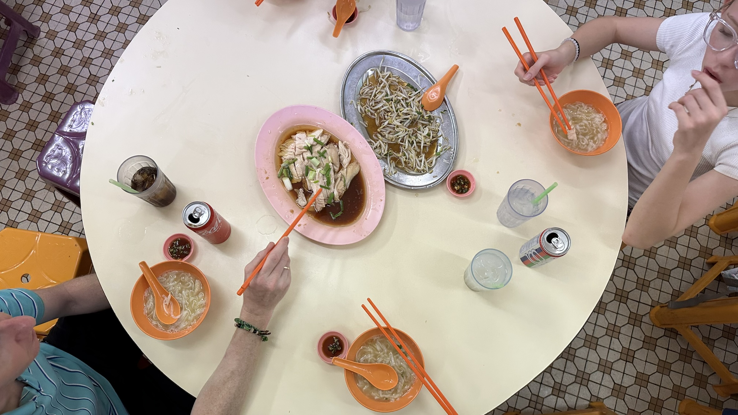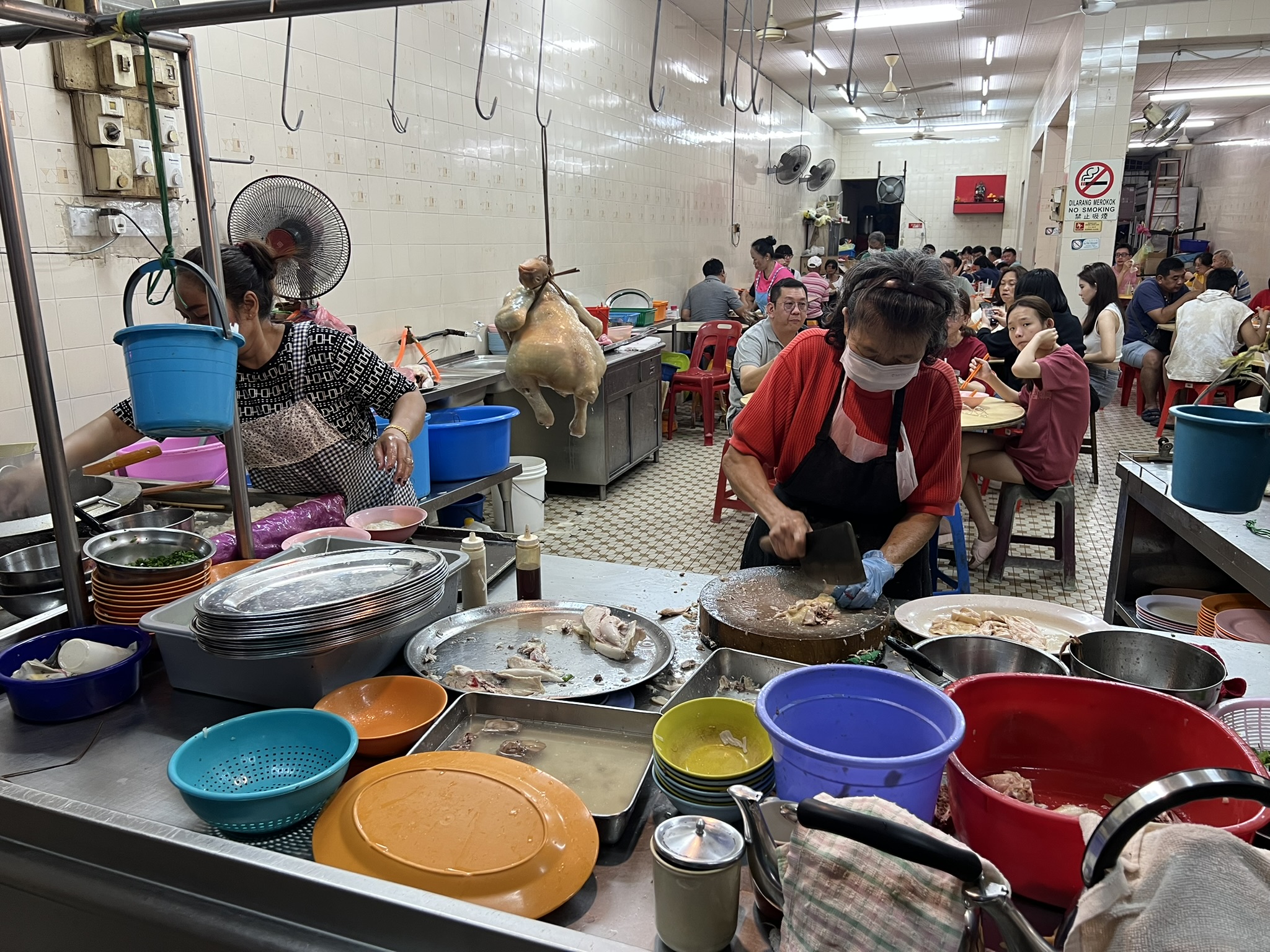 Uiteindelijk belanden de ‘hangry four’ bij een onooglijk tentje die ook op mijn lijst stond voor de beroemde hor fun (noodle soup), gepocheerde kip en grote schaal taugé: Cowan street Ayam Tauge! Blijkbaar is dat een ding hier. Er is geen menu, maar met dank aan de reviews en wat gebaren krijgen we uiteindelijk alles op tafel (waaronder per ongeluk een soort zoetig water met opgezwollen graankorrels er in – best okee, maar niet helemaal de bedoeling). We kopen op de terugweg op de night market nog een bekertje gesneden mango (eigenlijk bedoeld voor ‘Rojak’ – variant van de Indonesisch Rujak) voor het ontbijt (want in een AirBnB heb je natuurlijk geen ontbijtbuffet).