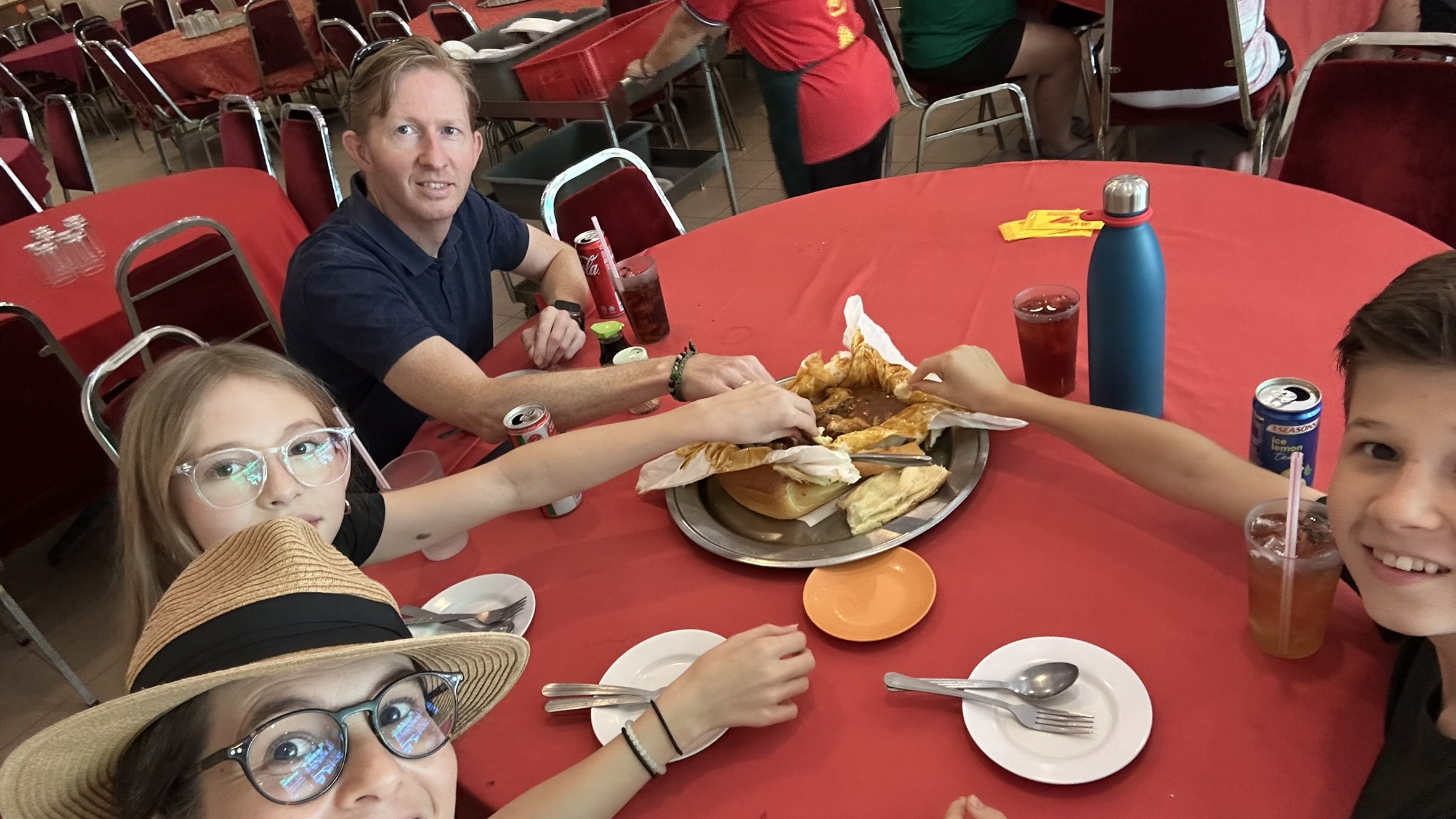 Het regent inmiddels flink als we vertrekken richting onze AirBnB in Ipoh waar we in een MiniMart even de sleutel ophalen en dan de auto in de bij de condo horende parkeergarage parkeren. Olle vraagt waarom we nu niet in een hotel zitten maar in een AirBnB. Ik leg uit dat ik ze wil meegeven dat je ook zo kunt reizen en niet altijd in een fancy duur hotel hoeft te verblijven. Olle is helemaal verbaasd dat dit goedkoper is dan een hotel en laat weten dat hij dit eigenlijk fijner vindt (hij heeft nu een eigen kamertje en hoeft niet met zijn zus te delen :-)). We moeten even de buien afwachten voor we op zoeken kunnen naar een van de restaurantjes die ik van te voren heb uitgezocht. Helaas blijkt de eerste optie op mijn lijst eigenlijk alleen open met lunch (wat op de een of andere manier met veel aanbevolen restaurantjes in Ipoh aan de hand lijkt.