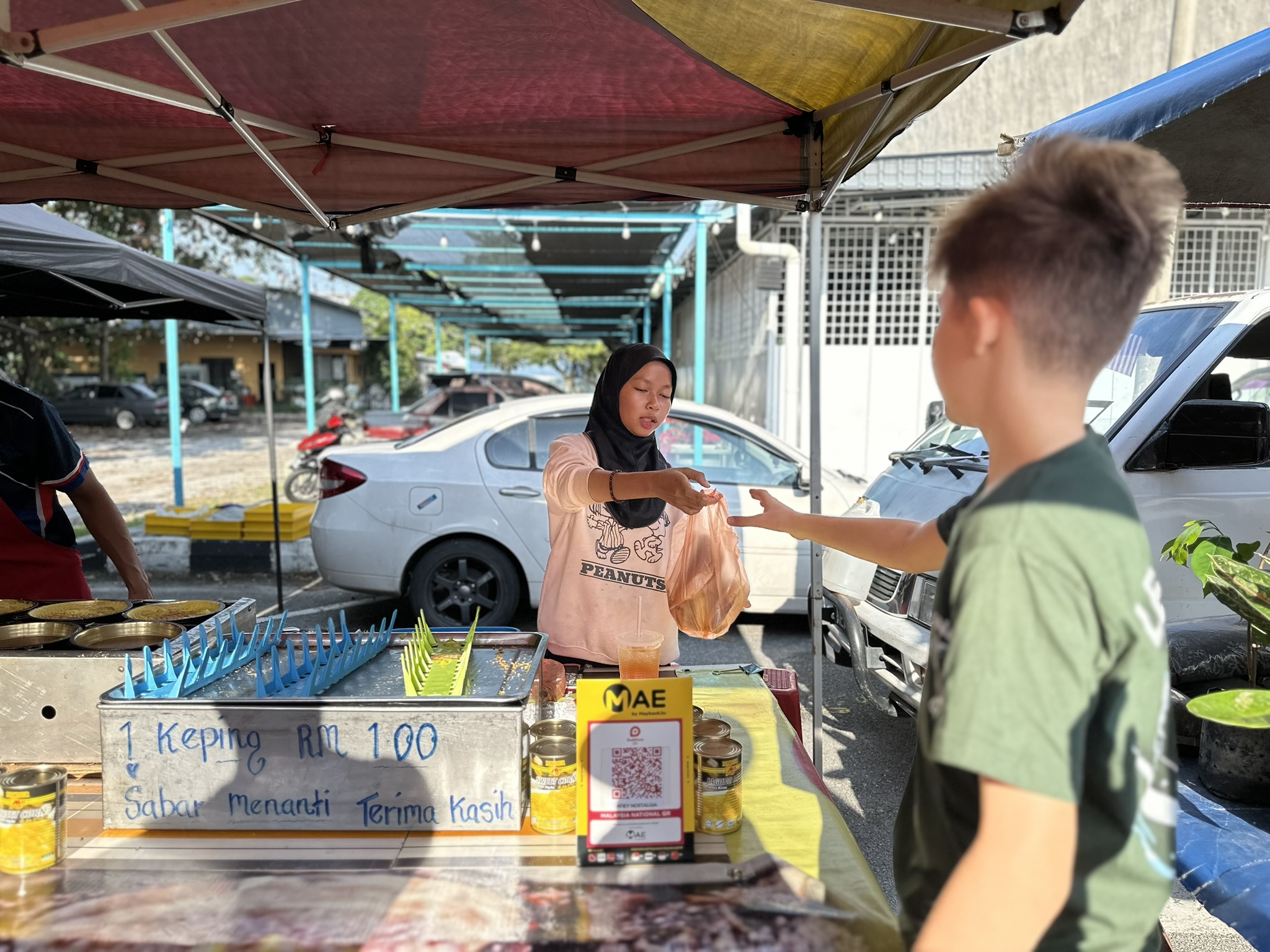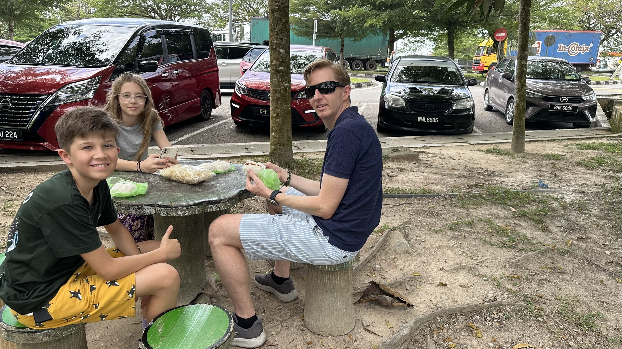 Onze gidsen van de vorige dag zijn er niet, maar de twee dames aan het tafeltje laten ons weten dat ze het er net over hadden. We mogen ‘m meenemen voor 30 Ringgit en krijgen de zak knikkers mee, en ook nog allemaal tips over wat en waar te eten en te doen vandaag.