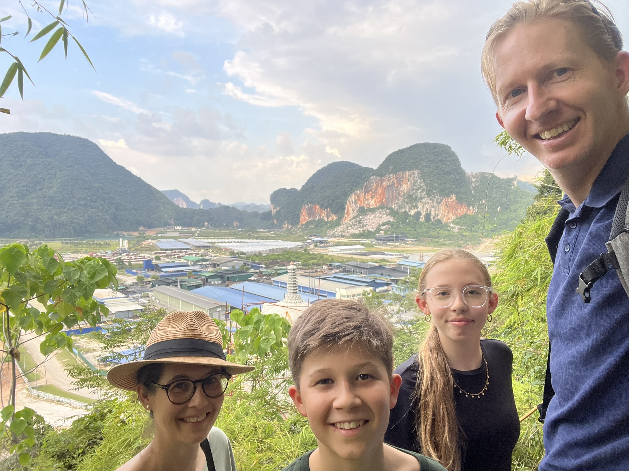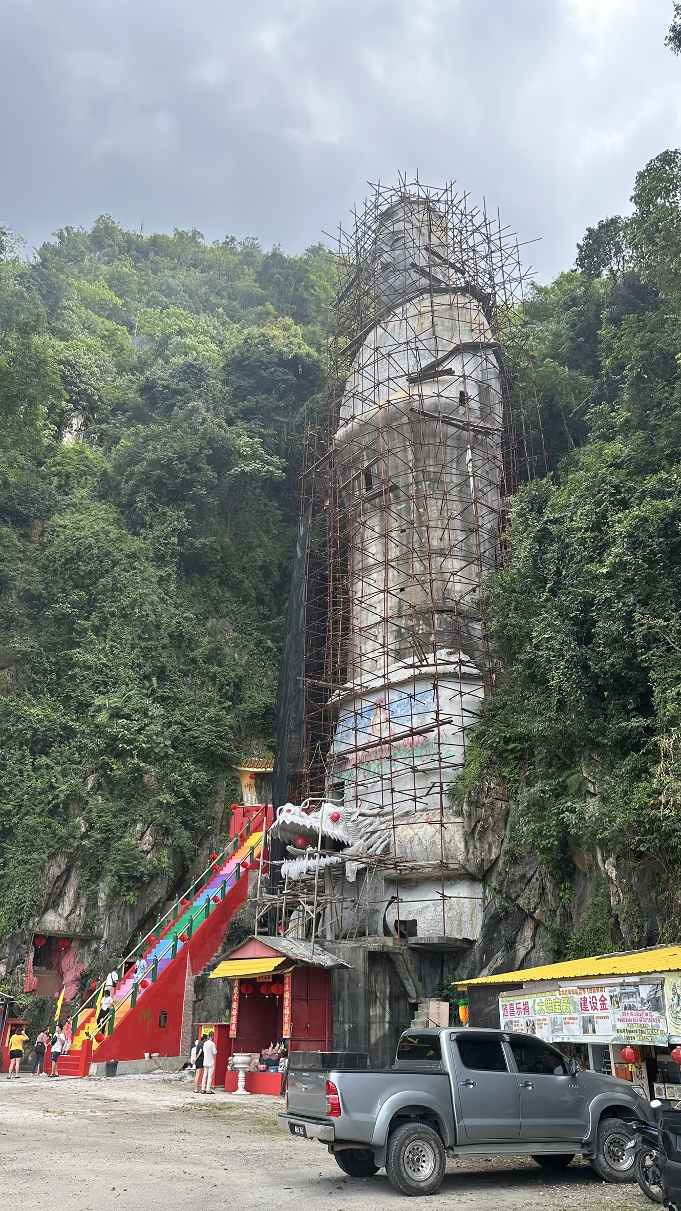 Op naar de laatste stop van vandaag: een cave temple in wording waar alles eigenhandig gebouwd wordt door de monnik, inclusief een flink standbeeld met verdiepingen, en steile trappetjes rond de berg. Helaas vinden we het fossiel van de tijger die in de berg zou moeten zitten niet, maar het uitzicht op de mooie bergen (en de lokale industrie) is ook leuk.