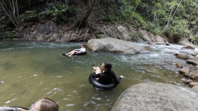 De volgende ochtend zit Cas al te werken in de schommelstoel in de gemeenschappelijke ruimte en komt de rest rustig uit bed gerold aan het ontbijt. Na het ontbijt melden we ons voor de ‘hike’. We krijgen een walkietalkie en een briefing met bij welke checkpoints we ons via de ‘porto’ moeten melden en wanen ons een beetje in wie is de mol. De hike brengt ons al slingerend door de jungle, en 40 minuten later zijn we al weer op het terrein van the Sticks. Nou, toch grappig, en niet al te heet onder de schaduw van alle bomen. Dan chillen Olle en ik wat bij het huisje (mijn lichaam is toch wat beurs na de avonturen de afgelopen dagen) en gaan Lexa en Cas nog even tuben in de rivier. Om 12 uur checken we uit, en krijgen nog een uitgebreide lunch voorgeschoteld. Na de lunch mogen we nog tot een uur of 3 blijven en spelen we nog lekker in de rivier, dobberen met de banden en dammetjes bouwen! We kleden ons weer om en rijden dan weer richting KL. Hoewel het een feestdag is (Thaipusam) valt het met extra files ontzettend mee. We komen redelijk op schema weer terug bij MK10, onze condo, en vinden na een paar omzwervingen dan eindelijk onze 3 (!) parkeerplekken in de garage. Als we uitgeladen zijn, is de man van de autoverhuur er ook weer om de auto op te halen. Wel heel makkelijk zo!