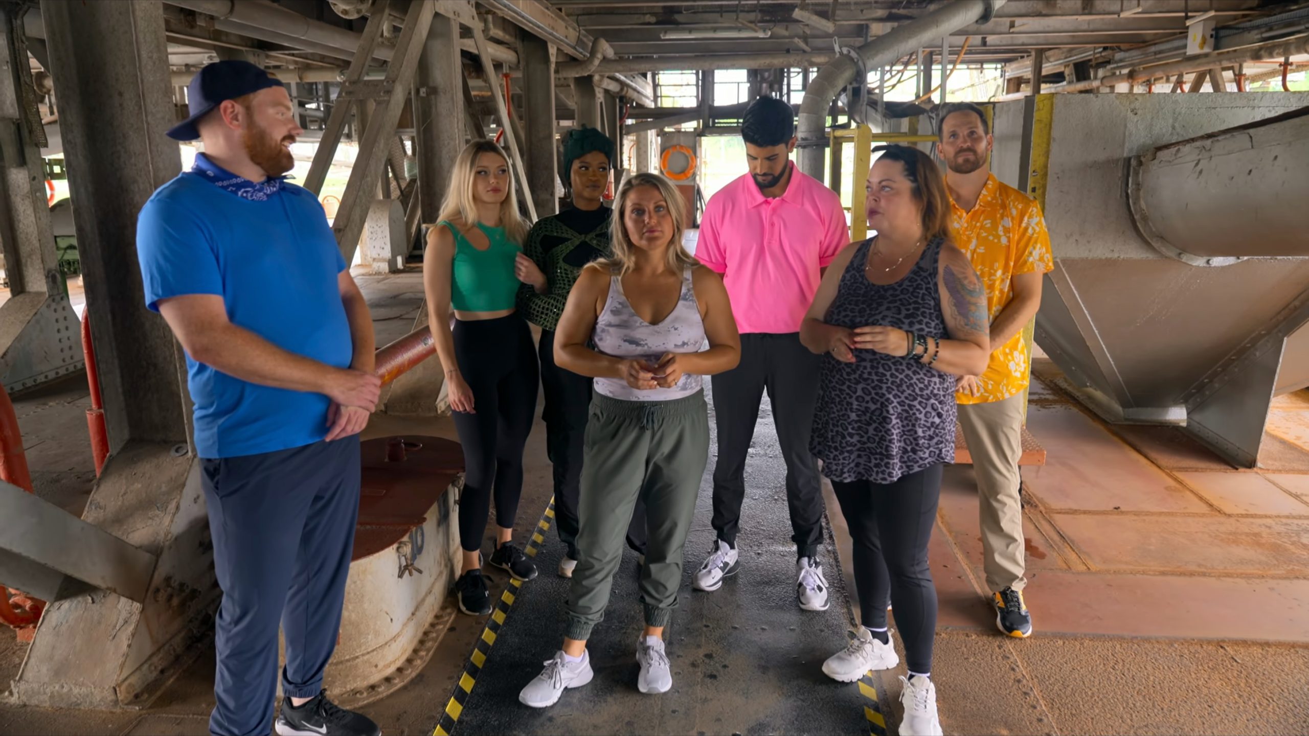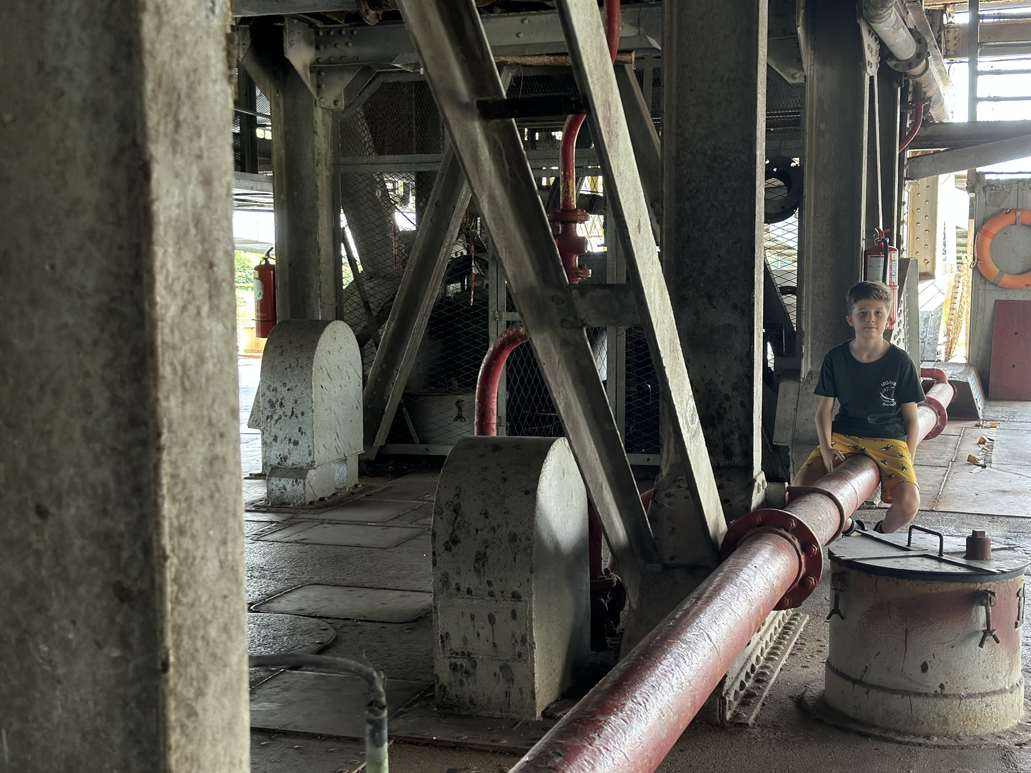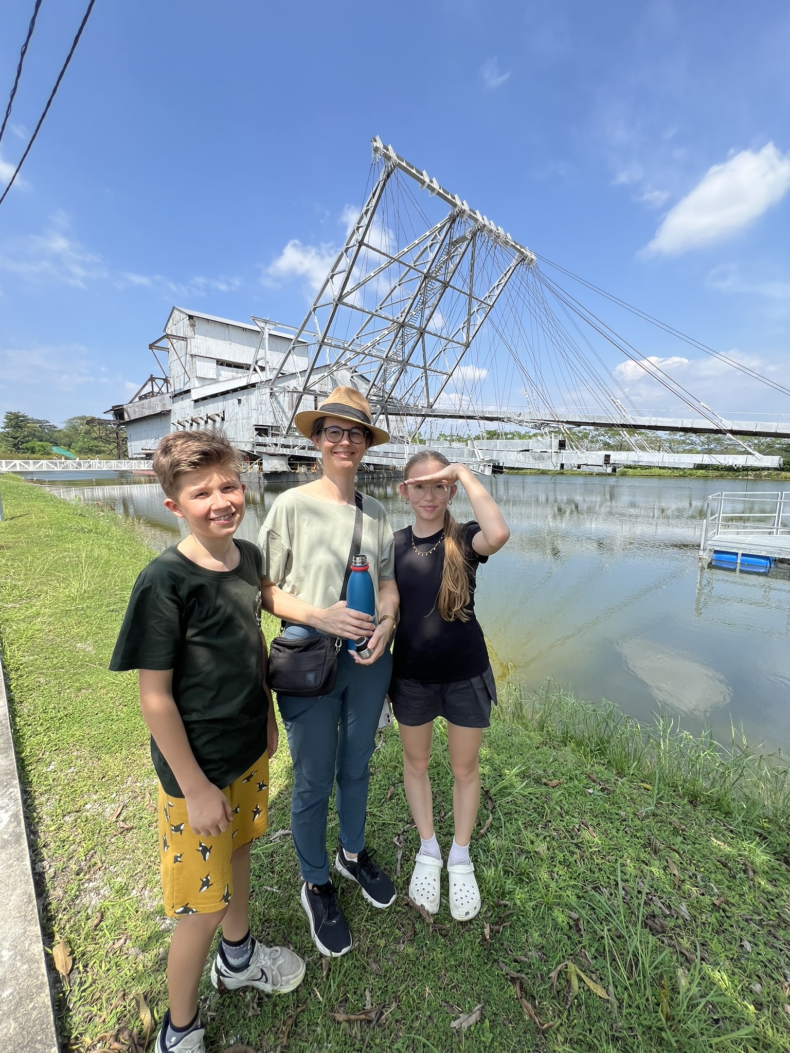 Na de lunch (en twee tevergeefse turbostops bij lokale Mr. DIY’s om te zien of ze misschien nog onze kommetjes in het assortiment hebben) rijden we door naar TT5, de laatste ‘tin-dredge company’. Pas als we het parkeerterrein op rijden, komen Lexa, Olle en ik tot de conclusie dat hier gewoon een Mol-opdracht was voor het tweede seizoen van de Amerikaanse ‘Wie is de Mol’ die we net hebben gekeken en we zijn een beetje starstruck. Nadat we ter plekke online ons kaartje kopen, en ons moeten registreren met een selfie (?), melden we ons bij het begin van de loopbrug. Hier wordt ons gezicht gescand en gaat het poortje automatisch open (wat een vreemde plek voor zo’n high tech, maar weinig privacy biedende toegangsprotocol?). Als molloten kijken we om ons heen om plekken te herkennen en dat is goed gelukt! De plekken waar de opdrachten waren zijn helaas niet toegankelijk, maar we hebben er toch eentje gevonden én de plekken van de briefings (en dat zonder de beelden bij de hand)!