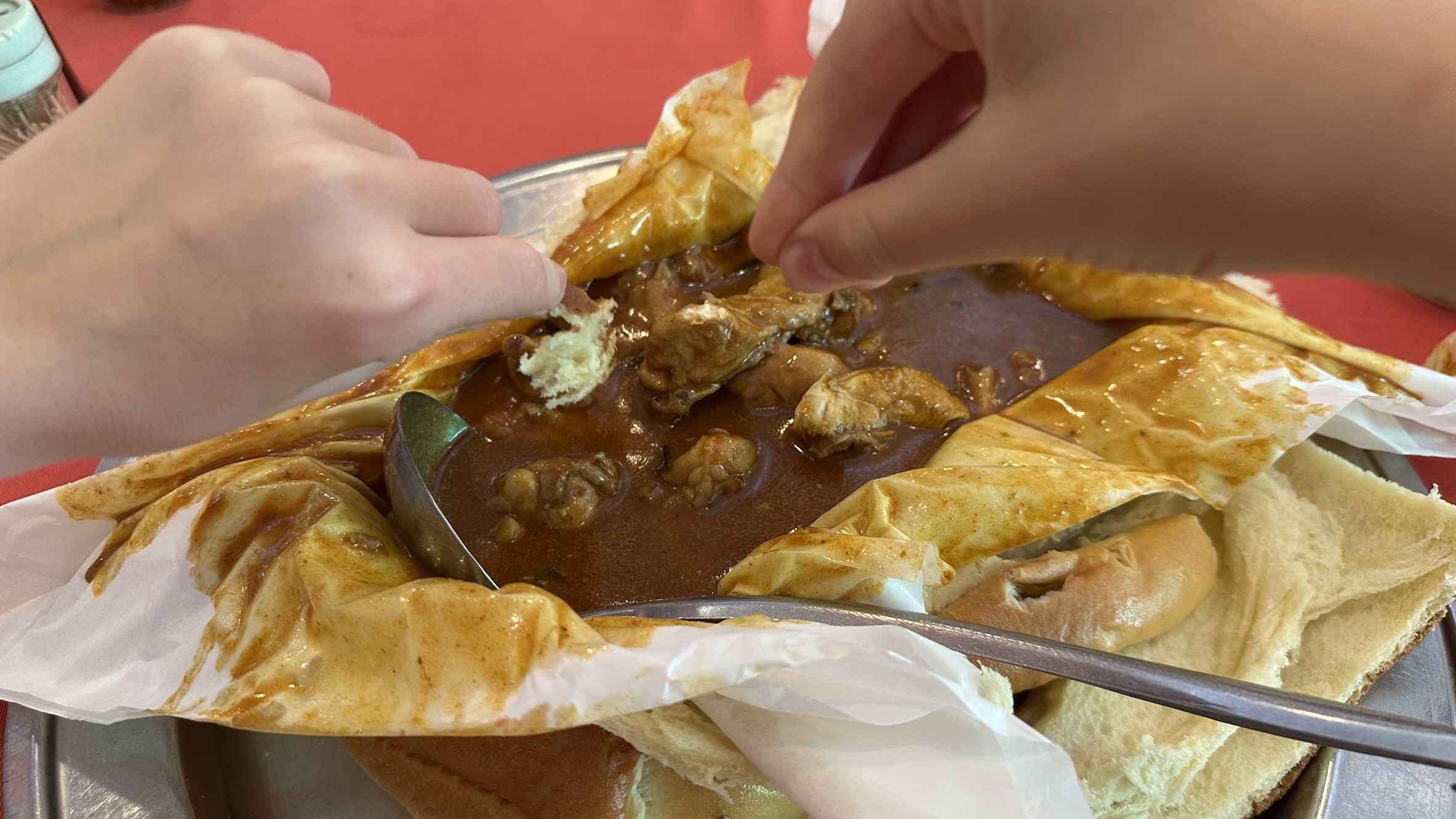 We rijden op hun advies naar het stadje Kampar om de beroemde ‘Curry Chicken Bun’ te proberen. De foodcourt die Cas op het oog had, blijkt vrij dicht te zijn, maar via google belanden we alsnog bij Yau Kee voor een zoet wit brood met daarin verstopt wat curry met kip en aardappel en wat stirfry ‘bettabuls’ met garlic (altijd lekker). We zijn wederom de enige witneuzen en kijken maar een beetje om ons heen om te snappen hoe je dit moet eten.