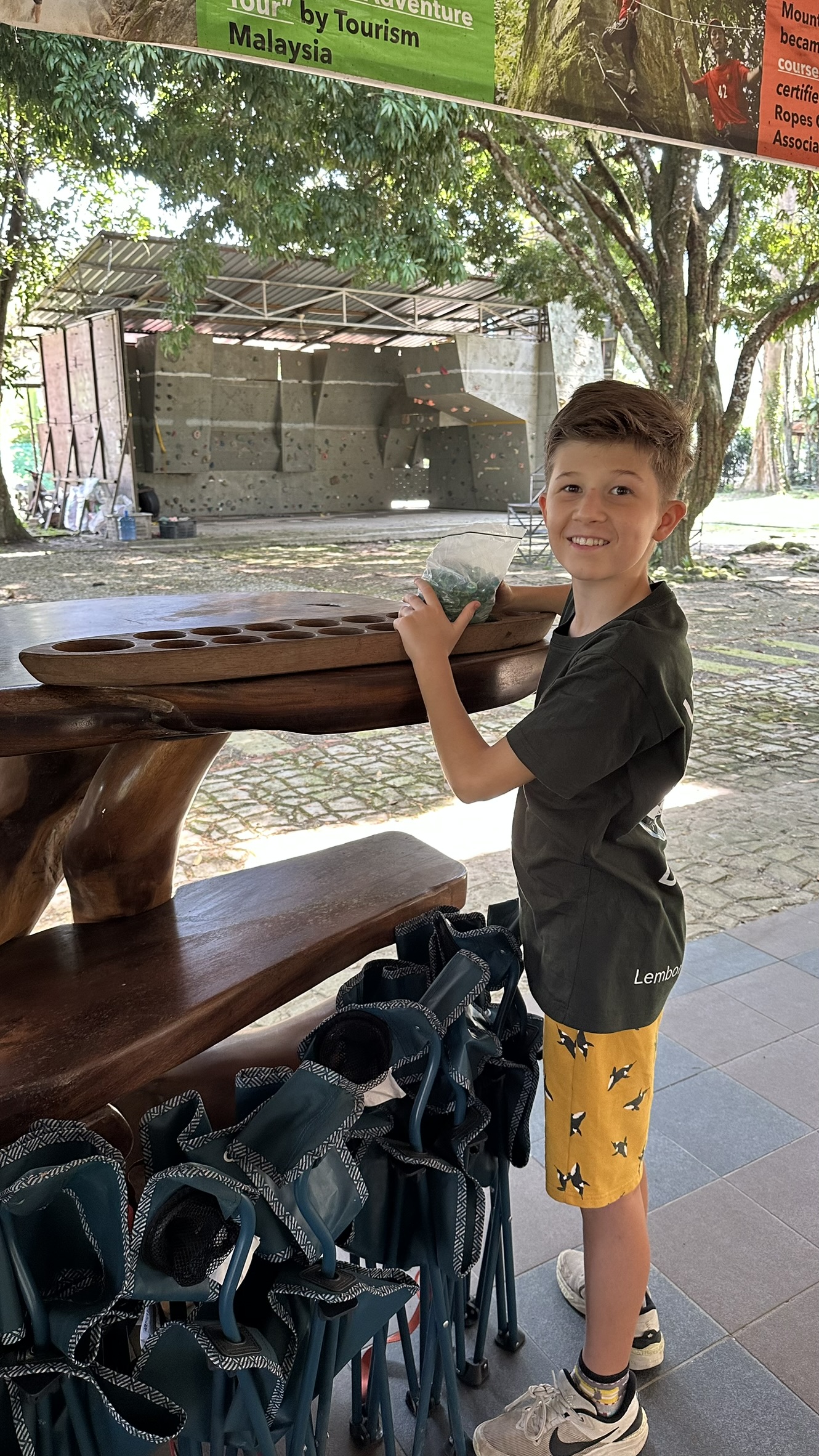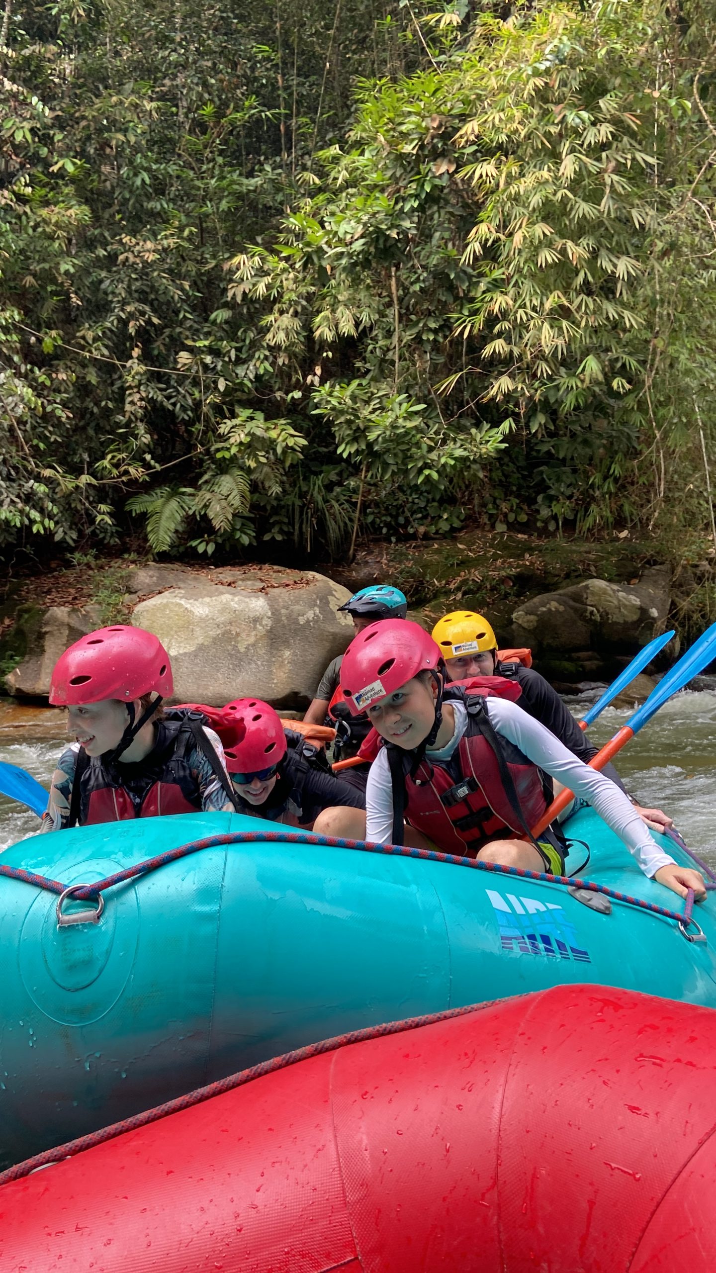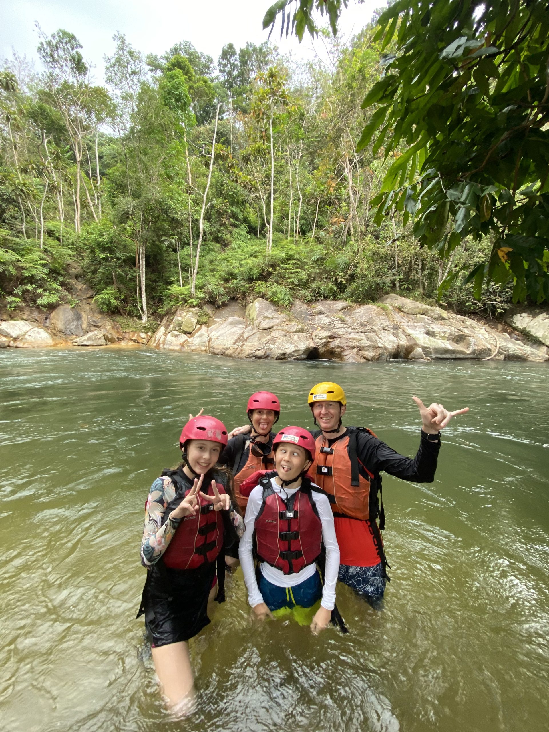 Nog vóór half 10 zijn we en route naar Gopeng voor een White Water Rafting tripje (die ik pas een dag van te voren heb geregeld). Ik twijfelde wel even over de veiligheid van deze activiteit omdat er in november in die rivier ook 3 mensen zijn omgekomen tijdens zo’n trip. Heel verdrietig. Zo’n trip regel je uiteraard ook weer via de WhatsApp, dus na een flink aantal berichtjes heen en weer hebben ze me overtuigd dat ze veiligheid hoog in het vaandel hebben staan (en dit ongeval volgens hen helaas voorkomen had kunnen worden als de gidsen de trip gewoon hadden afgeblazen) en ze ter plekke besluiten of het echt veilig genoeg is. Aangekomen blijkt Nomad Adventure ook het bedrijf te zijn waar Olle afgelopen november met zijn kamp geweest is van school. Zo kan hij ons enthousiast laten zien waar hij aan touwen heeft gehangen tussen de bomen, waar ze de instructies kregen en waar ze kratten torenhoog hebben opgestapeld als teambuilding activiteit. Er zit ook een maaltijd bij de activiteit inbegrepen dus we beginnen (na het ondertekenen van allemaal formulieren waarmee we onderkennen dat er risico’s aan de activiteit zitten) met een lekker bordje rijst met van alles en een stukje fruit, wat de hangry reisgenoten wel even kunnen gebruiken.