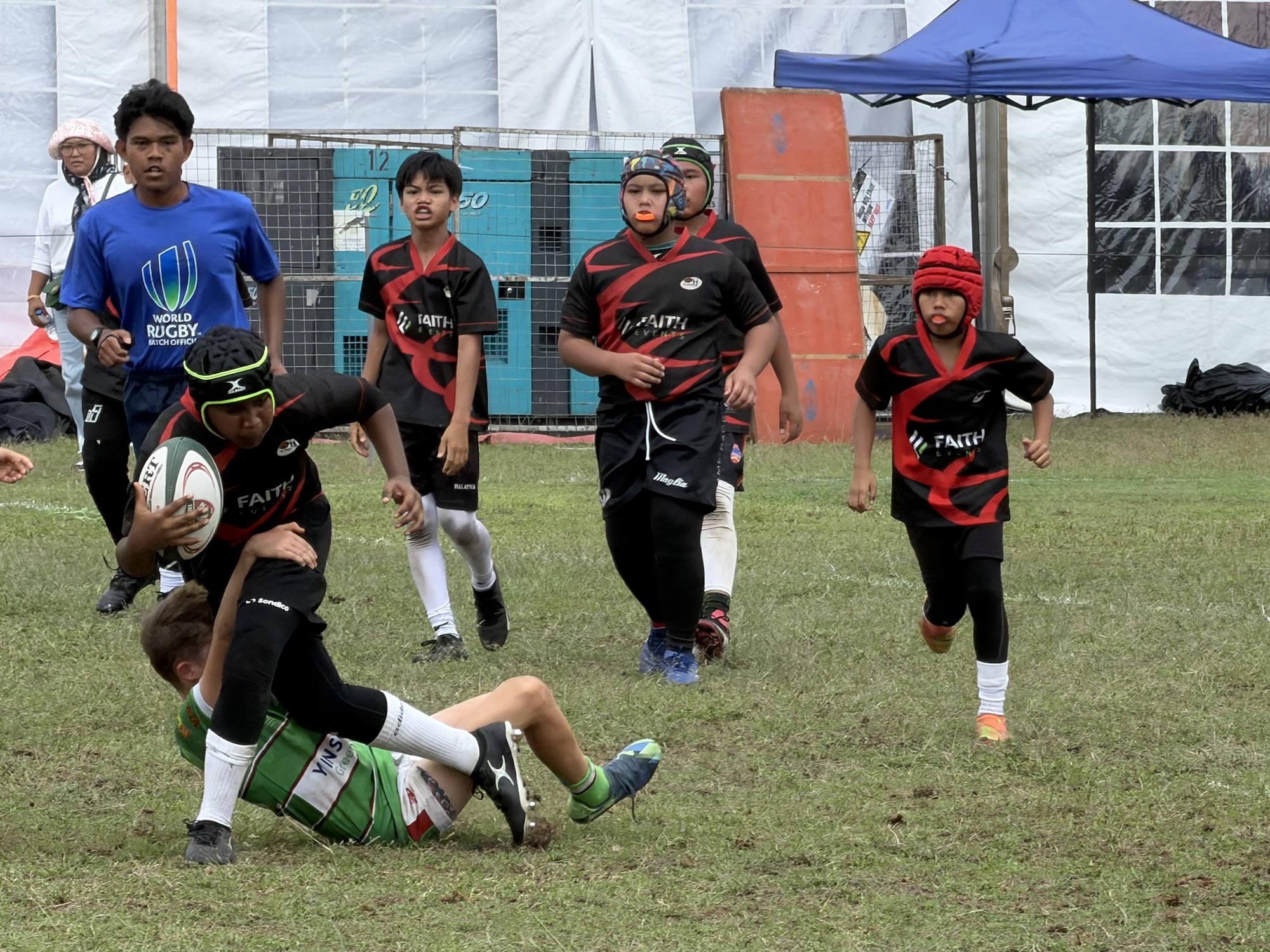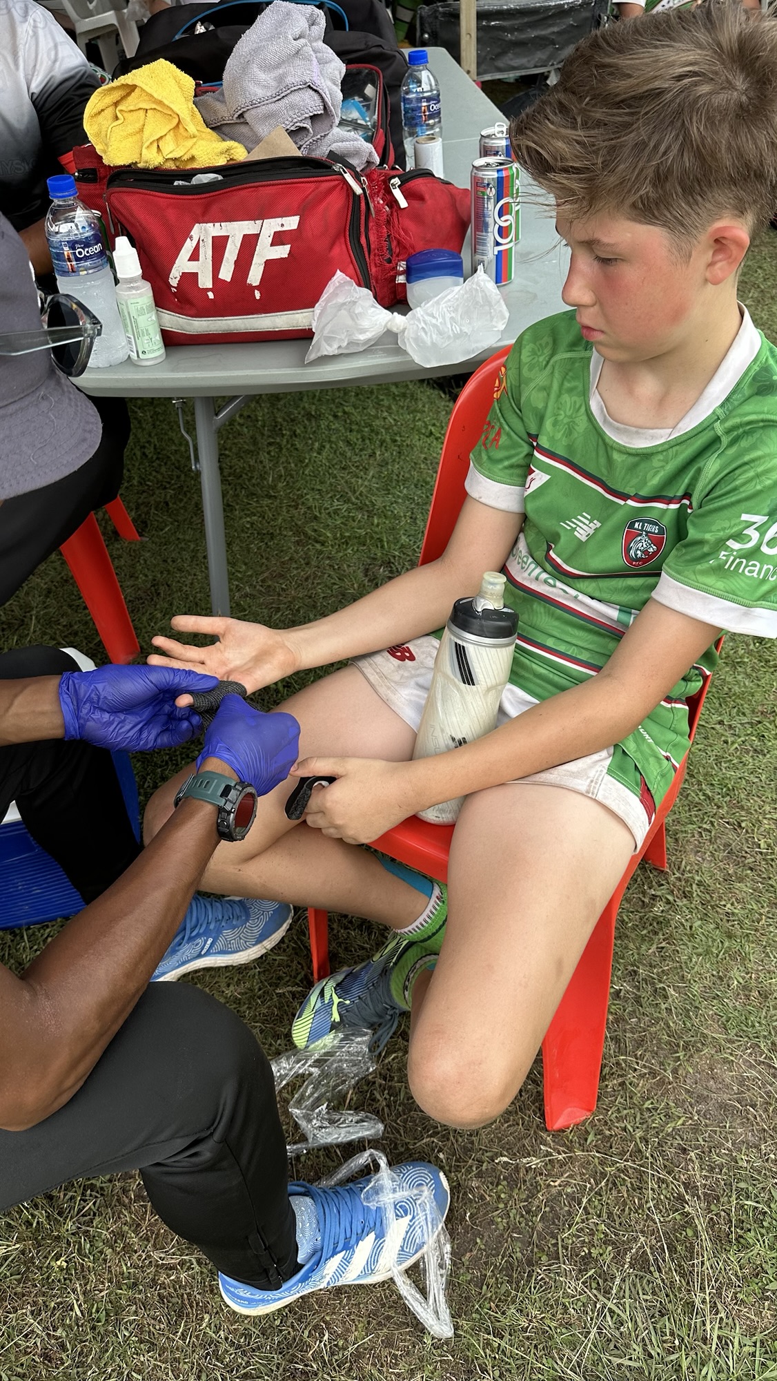 Na deze workout en een late lunch rijden Lexa en ik met de auto naar het rugbyfestijn en zien Olle nog in een wedstrijdje van 12 minuten een paar keer mooi in actie komen. Hij krijgt het wel flink te verduren dus gaat ‘weer’ (?!) even langs de EHBO post voor wat ijs op zijn pink waar hij wat noppen op heeft gehad (eerder al op zijn dij en op zijn wang, lekkere sport hoor). De bedoeling is dat ze nog een soort troostfinale zullen spelen, maar er zijn wat onweerflitsen dus iedereen wordt verzocht te gaan schuilen en niet op het open veld te blijven staan. Als duidelijk is dat er niet meer gespeeld gaat worden gaan we ook weer naar huis.