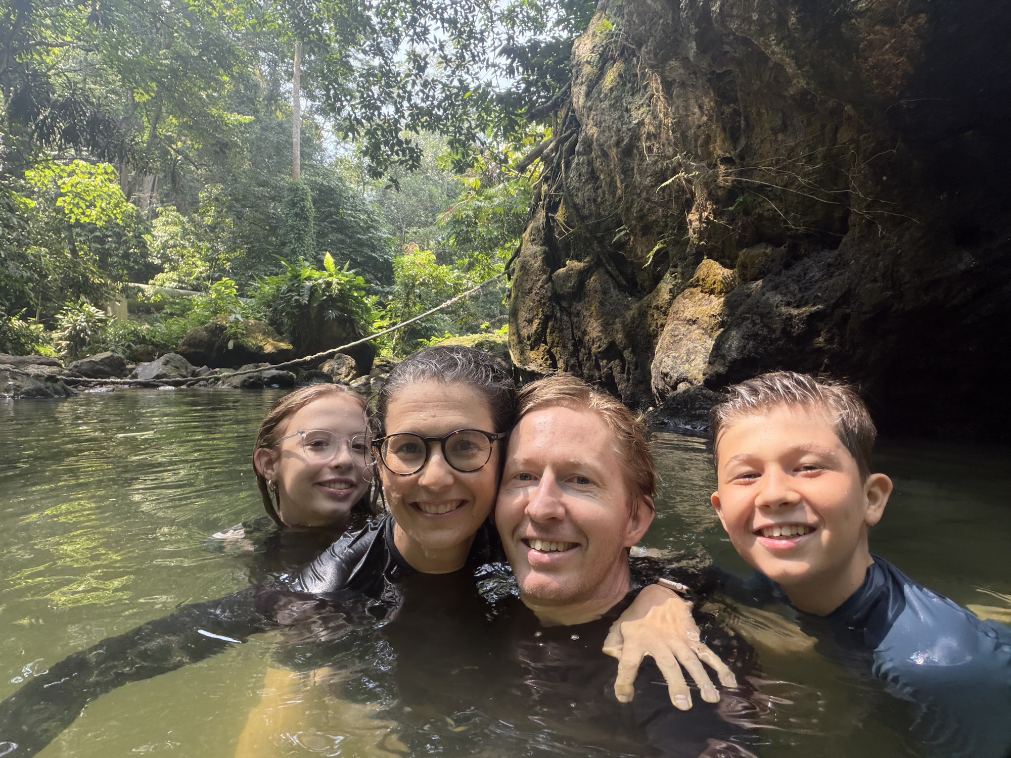 Lexa en Caspar willen ook wel van de rots afspringen en doen dat vol enthousiasme. Zooooo enthousiast, dat mevrouw vergeet dat ze een bril op heeft die natuurlijk afgevlogen is in de woeste sprong. Eh…. waar is die bril nu? De Maleise meisje helpen mee onderwater zoeken, maar zonder zwembril is en met al dat geroer in het water, is er eigenlijk niets te zien, ook al doet Cas een aantal dappere pogingen. We proberen ook nog met onze voeten de bodem af te tasten want heel veer kan ie niet gegaan zijn, maar helaas. Niet te vinden! Uiteindelijk als de meisjes het water uit zijn en we het water even laten rusten wordt het wat helderder en ja wel, daar spot Cas ineens toch nog Lexa’s bril!! Hij haalt ‘m uit het water en wordt enthousiast toegejuicht vanaf de kant door de Maleise dames die zelfs triomfantelijk hun armpjes in de lucht steken!
