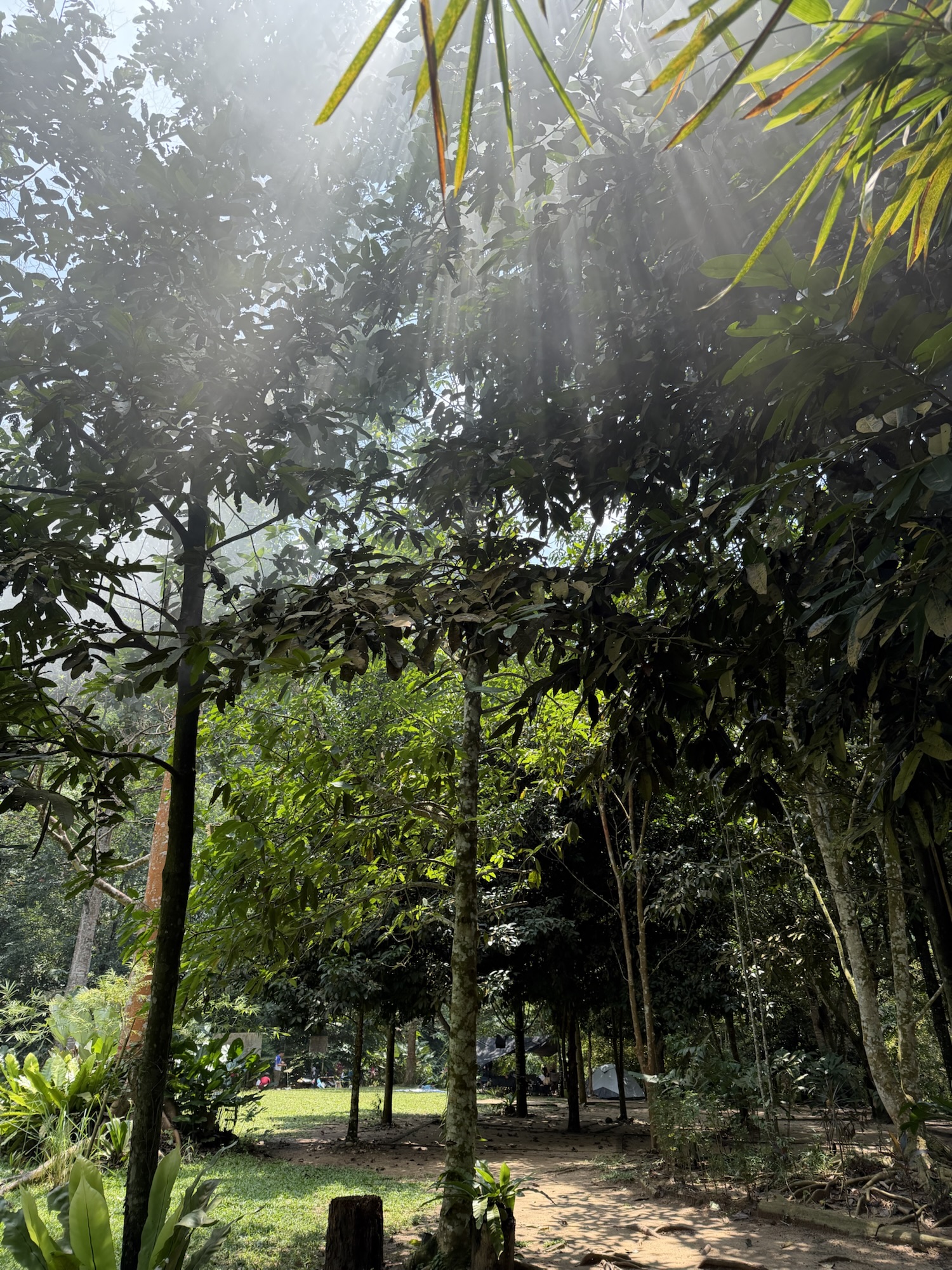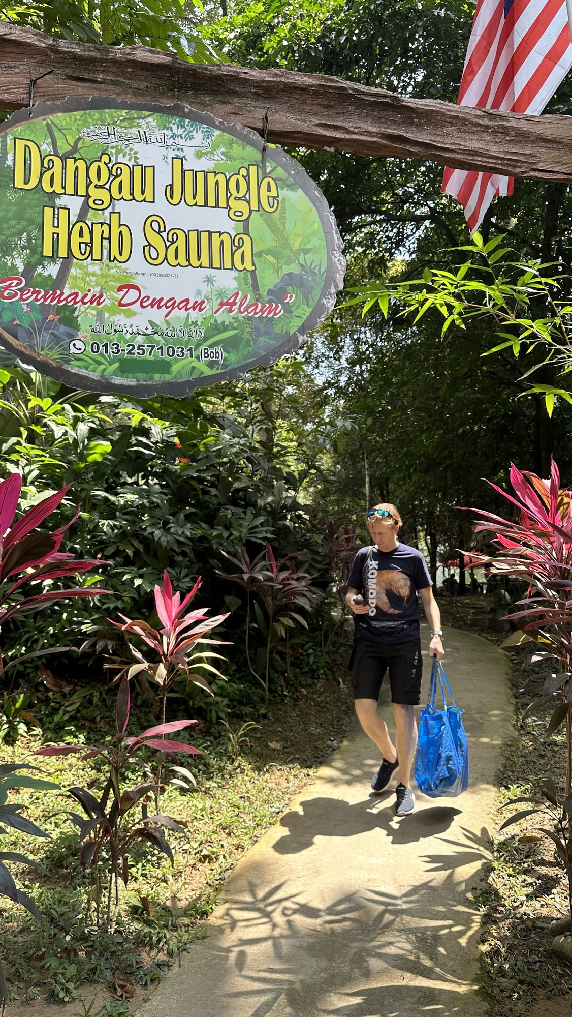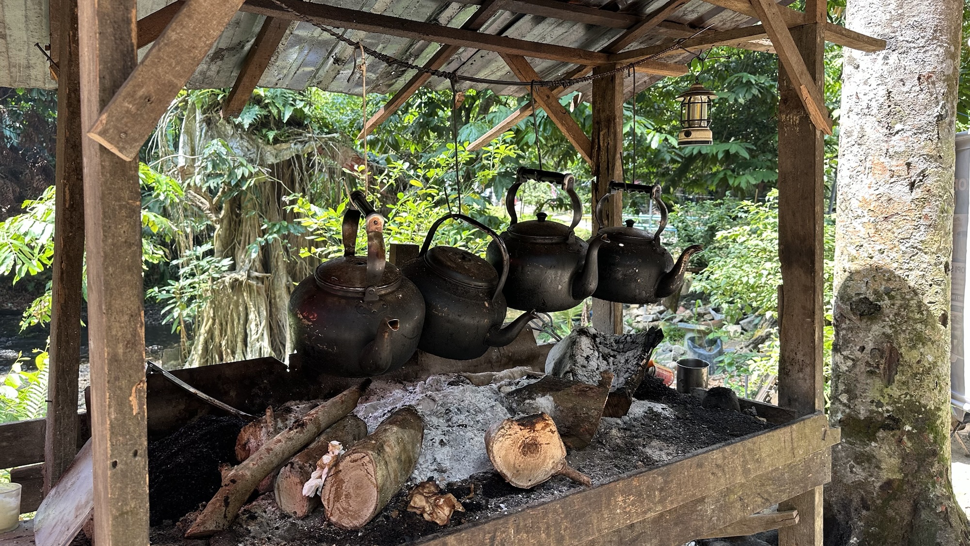 In het bos verscholen zit een verrassend gezellig open lucht foodcourtje waar je wat kunt drinken of eten uit bakken kunt scheppen maar we gaan eerst kijken of we nog ergens een dipje kunnen doen. Uiteindelijk belanden we bij de ‘herb sauna agro campsite’ waar Cas er net even te lang over doet om te ontdekken of we via deze campsite naar die jungle pools moeten dat de meneer van de camping de eerder genoemde prijs bestempelt tot prijs voor lokalen en ons een wat hogere prijs vraagt voor niet lokalen. Nou ja, ach. Het is nog steeds geen hoofdprijs, dus soit!