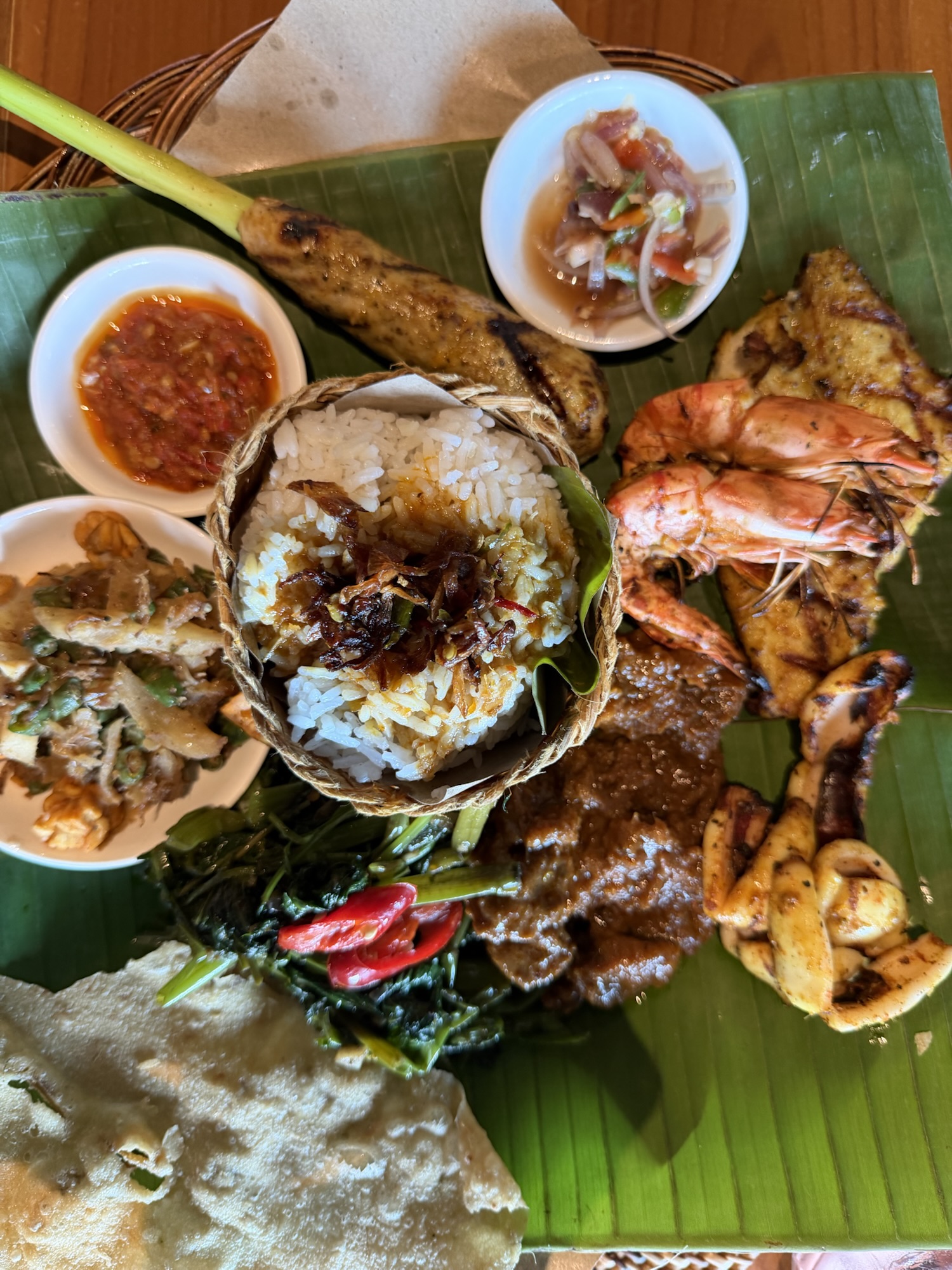 Dan drinken we nog even op het gezellige terrasje met lampjes een Ais Limau (zonder suiker, wat toch een beetje gek smaakt) en snacken er wat versgebakken Pisang Goreng bij. Jammie. Verder zien we niet echt aantrekkelijke lunchopties (de schepbakken zijn we nooit zo’n fan van) dus besluiten we ergens op de weg terug te gaan eten.
