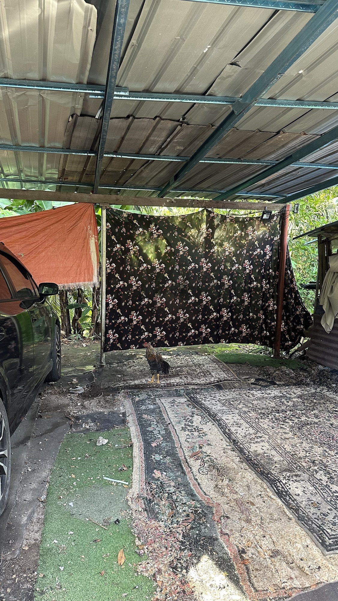 Er zouden hier in de buurt ook zwembare ‘jungle pools’ moeten zijn, en die gaan we nu zoeken. Het is een wat obscure (en hele smalle) route langs huisjes waar allemaal kippen scharrelen maar uiteindelijk vinden we een (volle) parkeerplaats en zetten onze wagen dan maar lomp in de speeltuin waar wel plek is en lopen dan met onze wandelgear richting de jungle pools.