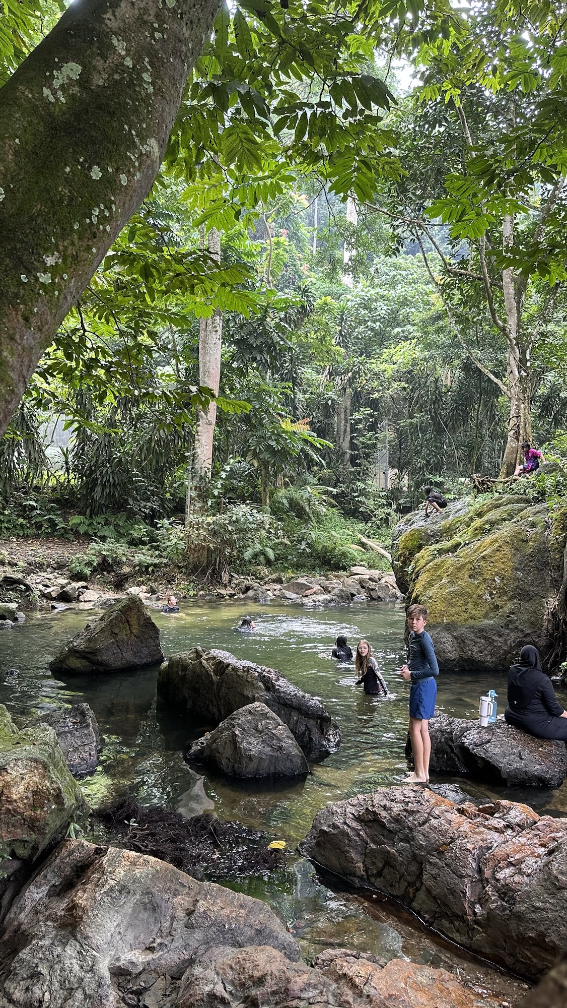 Hij begeleidt ons naar een grote boom achterop het terrein waar we twee moeders met hun vier dochters al lekker zien poedelen. De moeders zitten lekker op een campingstoeltje in het water te beppen en de meiden springen om en om van een hoge rots af. OK, toch wel een leuk plekje. We trekken onze kleren uit (onze zwemkleren hadden we er onder al aan), en onze zwemshirtjes aan en gaan dan blootvoets het water in want de waterschoenen hadden we nou net niet meegenomen.
