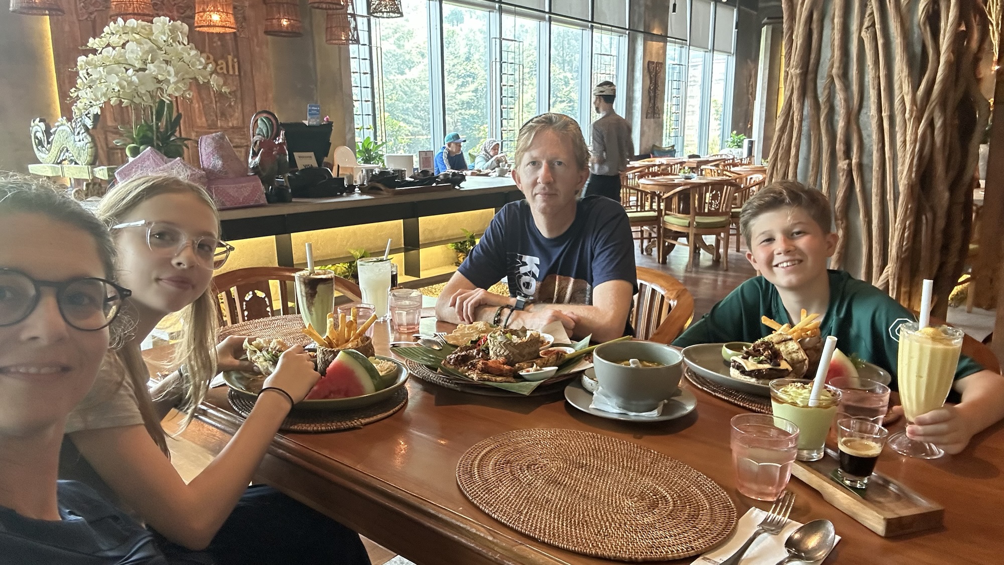 We belanden in een mall die we nog niet kenden (dat zijn er nog genoeg, zoveel Malls zijn er hier!): de KL East Mall . Hier vinden we weer met hulp van Google map een Balinees restaurant met een leuke naam (Ole-Ole) en westerse opties wat de kinderen wel kunnen waarderen. De porties zijn flink groot en het smaakt allemaal prima: Soto ayam en Kopi alpukat, een toch wat tegenvallende niet verse mango milkshake smoothie, een flink bord Nasi Campur met verrassend lekkere gebarbecuede inktvis, en de kinderen een burger en een broodje veggies (helaas met paddestoelen voor Lexa). We doen flink ons best en met volle buikjes lopen Lexa en ik nog even snel langs de Jaya voor wat appels en mandarijnen. Tergend voor mij natuurlijk, niet even mogen rondneuzen in een onbekende supermarkt! Maar goed, de mannen zitten alweer in de auto op ons te wachten, dus: hop hop!